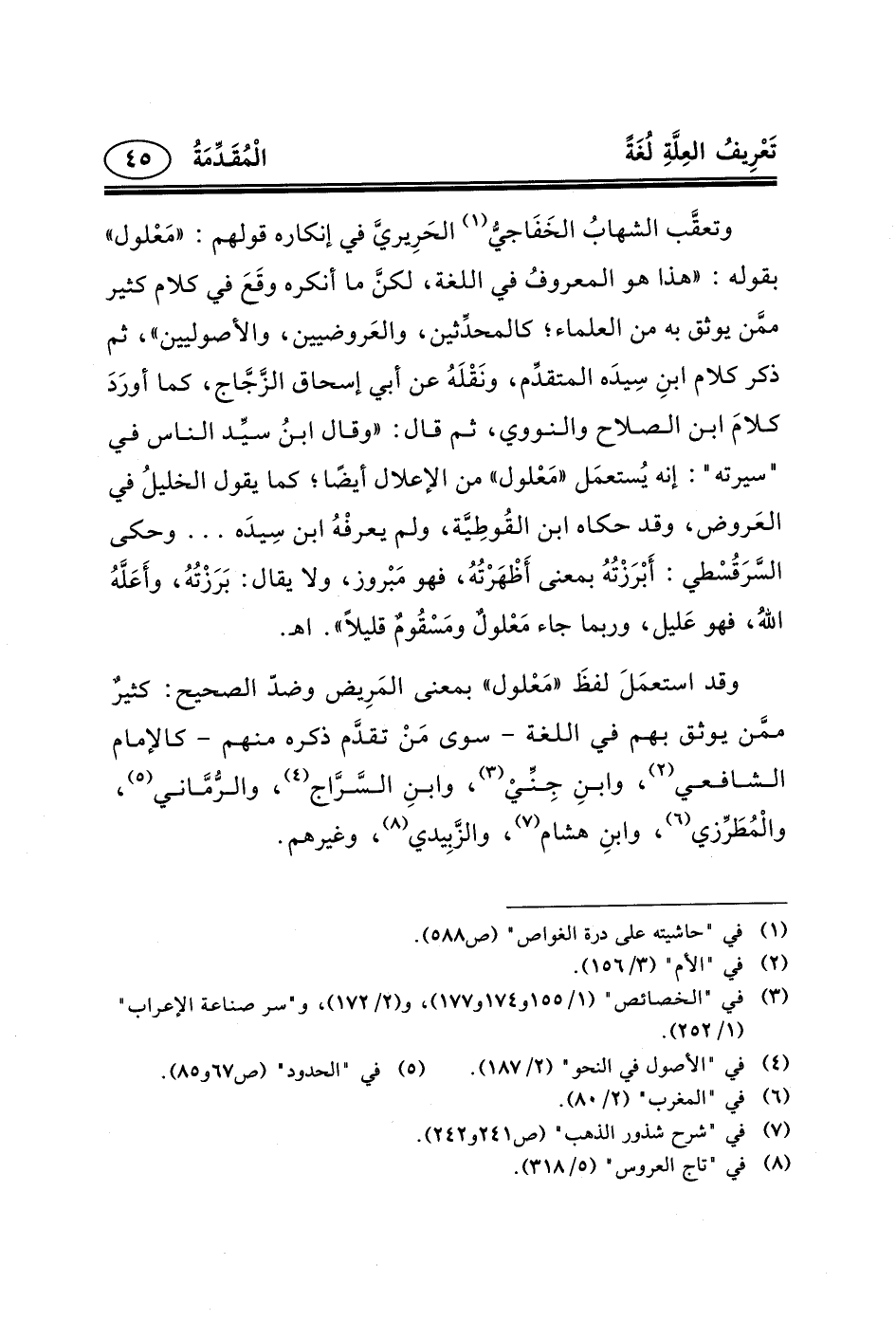 وتعقَّب الشهابُ الخَفَاجيُّ (١) الحَرِيريَّ في إنكاره قولهم: «مَعْلول» بقوله: «هذا هو المعروفُ في اللغة، لكنَّ ما أنكره وقَعَ في كلام كثير ممَّن يوثق به من العلماء؛ كالمحدِّثين، والعَروضيين، والأصوليين» ، ثم ذكر كلام ابنِ سِيدَه المتقدِّم، ونَقْلَهُ عن أبي إسحاق الزَّجَّاج، كما أورَدَ كلامَ ابن الصلاح والنووي، ثم قال: «وقال ابنُ سيِّد الناس في "سيرته": إنه يُستعمَل «مَعْلول» من الإعلال أيضًا؛ كما يقول الخليلُ في العَروض، وقد حكاه ابن القُوطِيَّة، ولم يعرفْهُ ابن سِيدَه ... وحكى السَّرَقُسْطي: أَبْرَزْتُهُ بمعنى أَظْهَرْتُهُ، فهو مَبْروز، ولا يقال: بَرَزْتُهُ، وأَعَلَّهُ اللهُ، فهو عَليل، وربما جاء مَعْلولٌ ومَسْقُومٌ قليلاً» . اهـ.