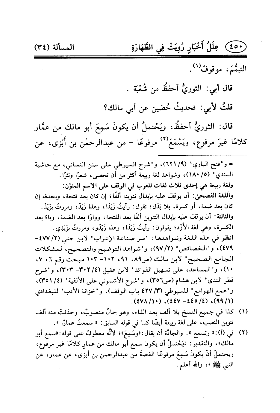 (٢) في (أ) : «وتسمع» . والجادَّة أن يقال: «وسَمِعَ» ؛ لأنَّه معطوفٌ على قوله: «سمع أبو مالك» ، والتقدير: «يَحْتملُ أن يكون سَمِعَ أَبُو مالك من عمارٍ كلامًا غير مرفوع، ويحتملُ أنْ يكونَ سَمِعَ مرفوعًا القصةَ من عبد الرحمن بْنِ أبزى، عَن عمار، عَنِ النبي (ص) » ، والله أعلم.