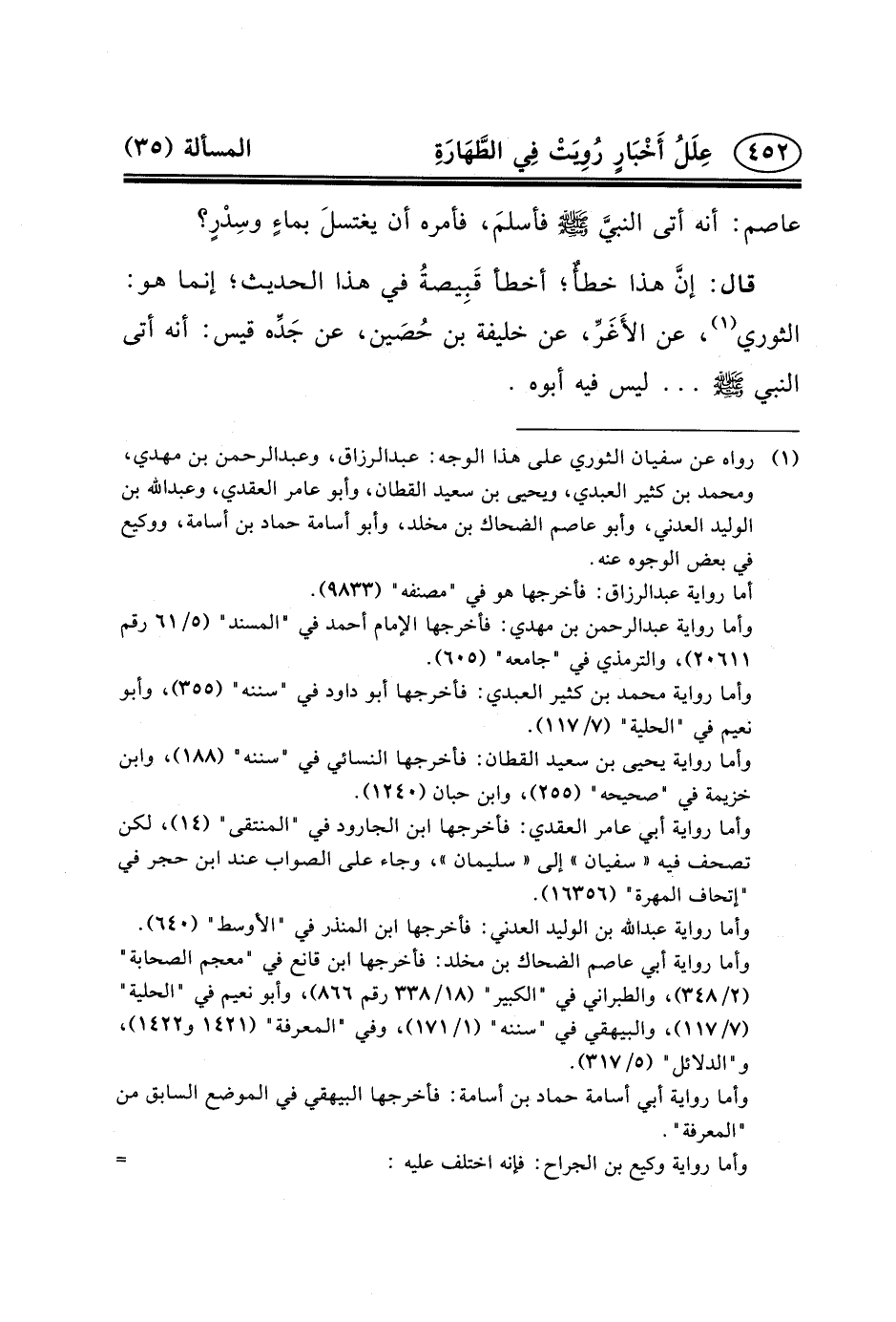 عاصم: أنه أتى النبيَّ (ص) فأسلمَ، فأمره أن يغتسلَ بماءٍ وسِدْرٍ؟