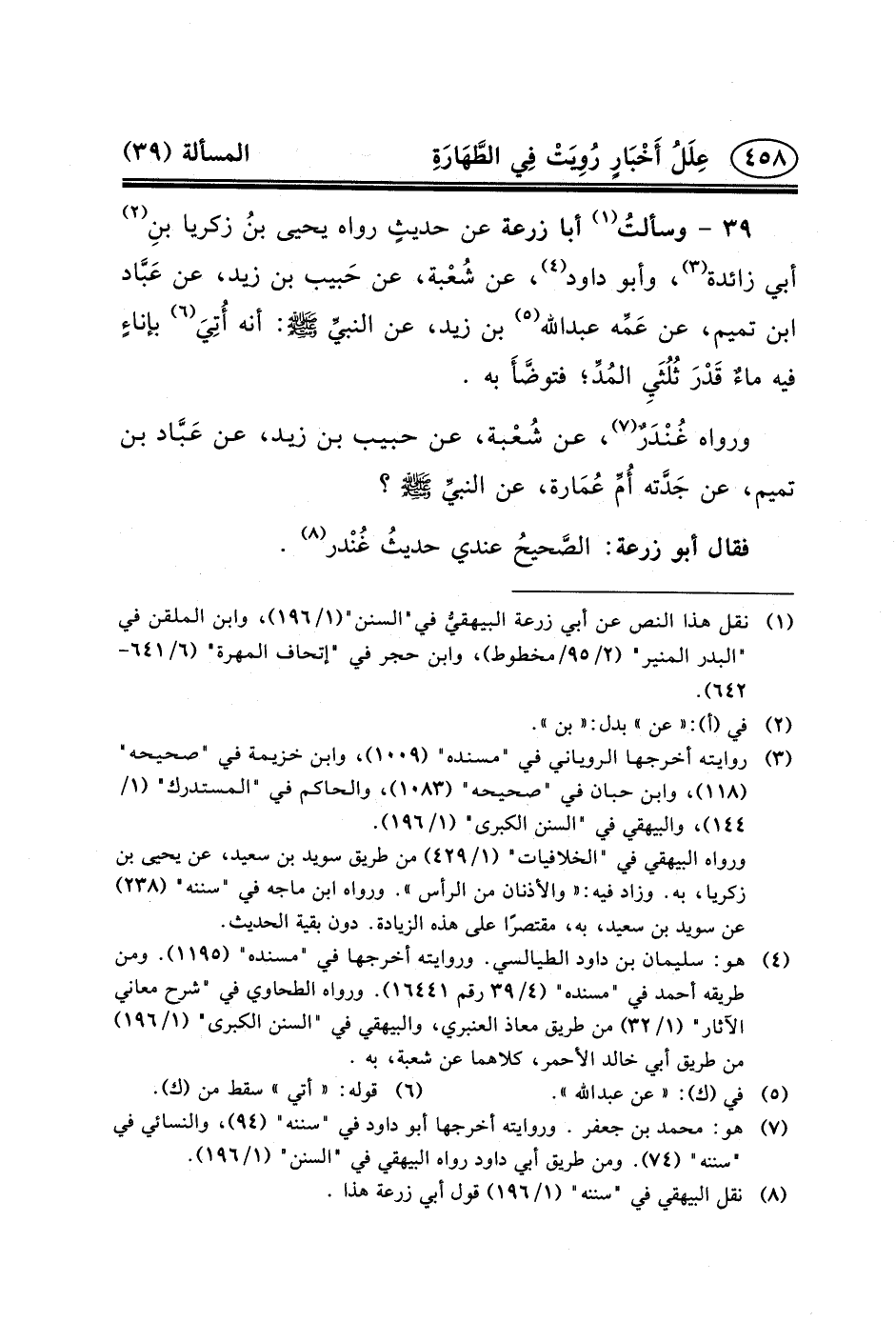 ٣٩ - وسألتُ (١) أَبَا زُرْعَةَ عَنْ حديثٍ رَوَاهُ يَحْيَى بنُ زكريا بنِ (٢) أَبِي زائدة (٣) ، وَأَبُو دَاوُدَ (٤) ، عَنْ شُعْبة، عَنْ حَبيب بْنِ زيد، عَنْ عَبَّاد بْنِ تَميم، عَن عَمِّه عبد الله (٥) بن زيد، عن النبيِّ (ص) : أَنَّهُ أُتِيَ (٦) بإناءٍ فِيهِ ماءٌ قَدْرَ ثُلُثَيِ المُدِّ؛ فتوضَّأَ بِهِ.