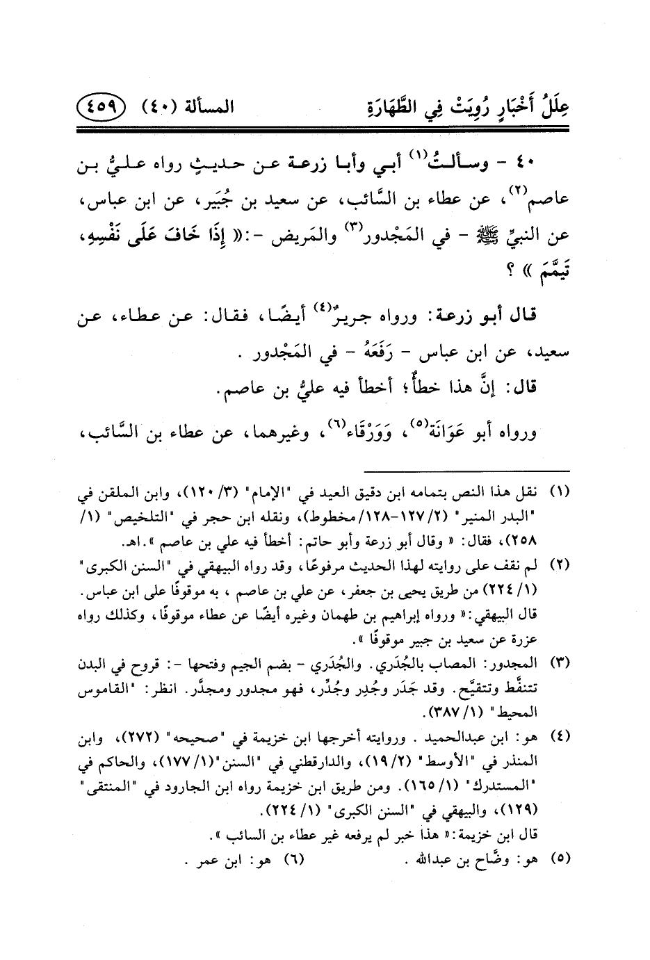 ٤٠ - وسألتُ (١) أَبِي وَأَبَا زُرْعَةَ عَنْ حديثٍ رَوَاهُ عليُّ بْنُ عَاصِم (٢) ، عَنْ عَطَاءِ بْنِ السَّائب، عَنْ سَعِيدِ بْنِ جُبَير، عَنِ ابْنِ عباس، عن النبيِّ (ص) - فِي المَجْدور (٣) والمَريض -: إِذَا خَافَ عَلَى نَفْسِهِ، تَيمَّمَ؟