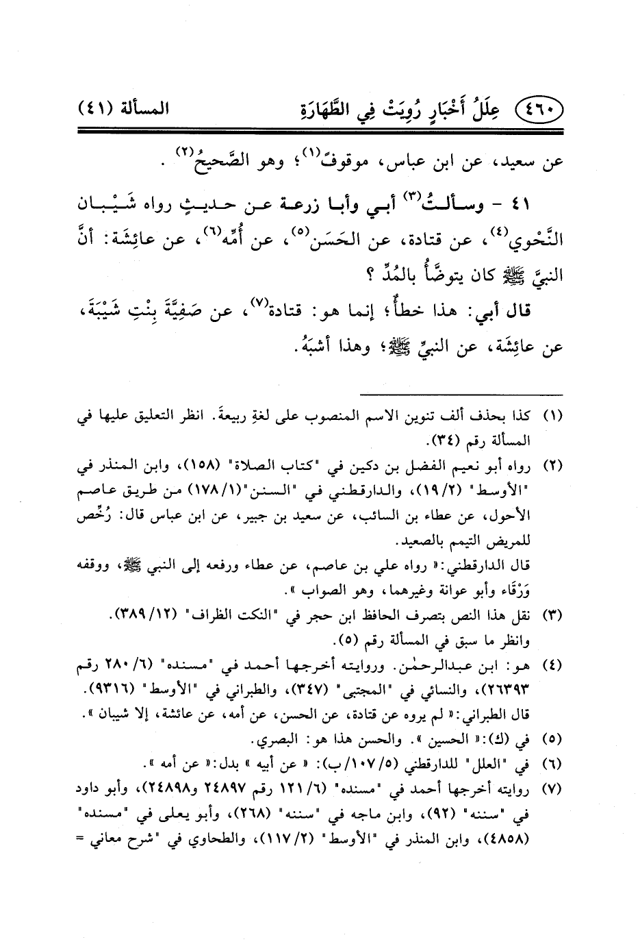 ٤١ - وسألتُ (٣) أَبِي وَأَبَا زُرْعَةَ عَنْ حديثٍ رَوَاهُ شَيْبان النَّحْوي (٤) ، عَنْ قَتَادَةَ، عَنِ الحَسَن (٥) ، عَنْ أُمِّه (٦) ، عَنْ عائِشَة: أنَّ النبيَّ (ص) كَانَ يتوضَّأُ بالمُدِّ؟