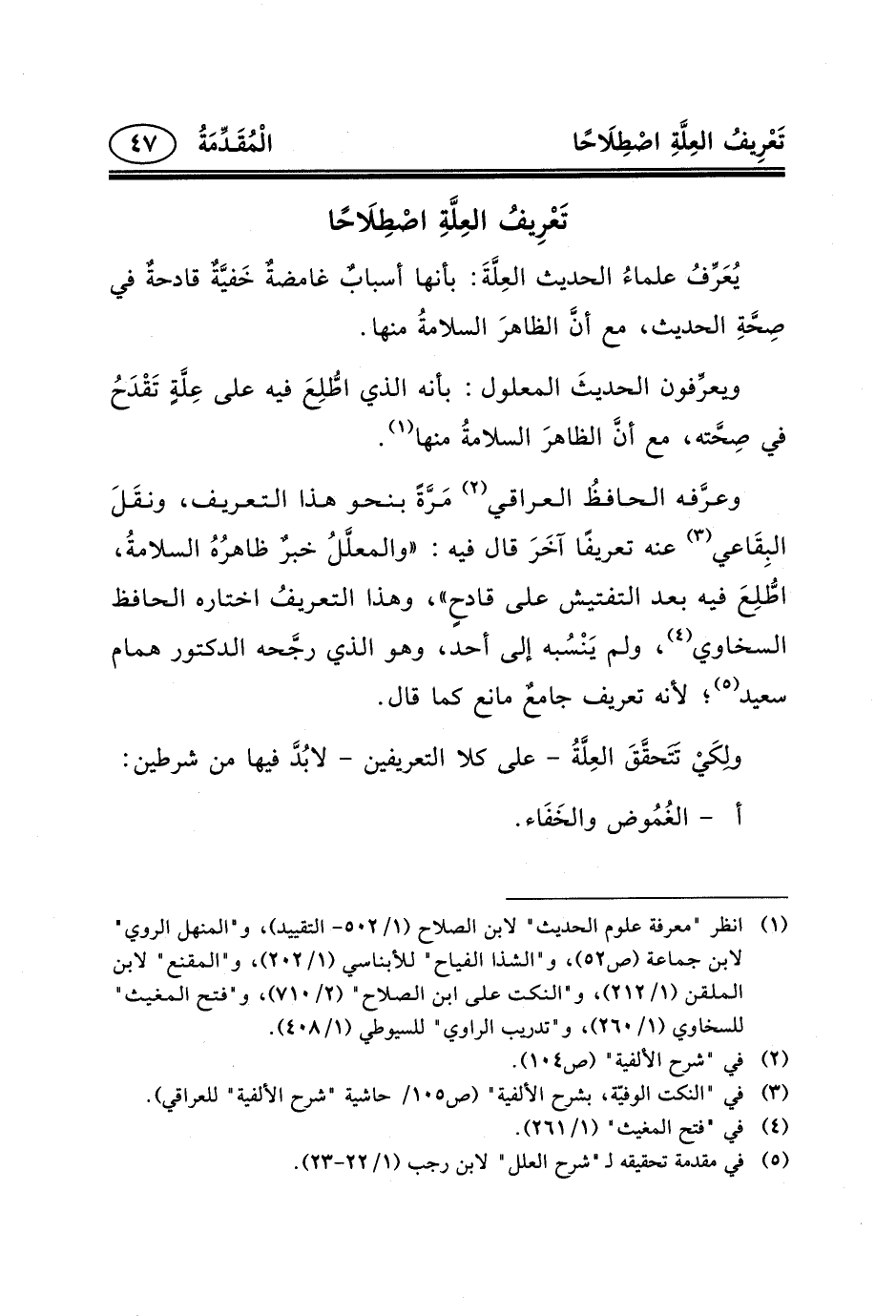 يُعَرِّفُ علماءُ الحديث العِلَّةَ: بأنها أسبابٌ غامضةٌ خَفيَّةٌ قادحةٌ في صِحَّةِ الحديث، مع أنَّ الظاهرَ السلامةُ منها.