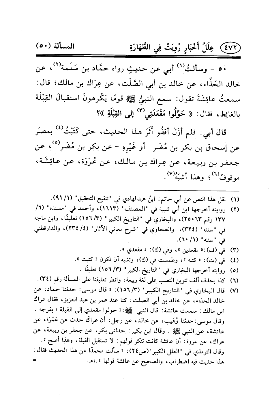 ٥٠ - وسألتُ (١) أَبِي عَنْ حديثٍ رَوَاهُ حمَّاد بْنُ سَلَمة (٢) ، عَنْ خَالِدٍ الحَذَّاء، عَنْ خَالِدِ بْنِ أَبِي الصَّلْت، عَنْ عِرَاك بْنِ مَالِكٍ؛ قَالَ: سمعتُ عائِشَةَ تَقُولُ: سَمِعَ النبيُّ (ص) قَوْمًا يَكْرهونَ استقبالَ القِبْلَة بالغائِط، فقال: حَوِّلُوا مَقْعَدَتِي (٣) إِلَى القِبْلَةِ؟