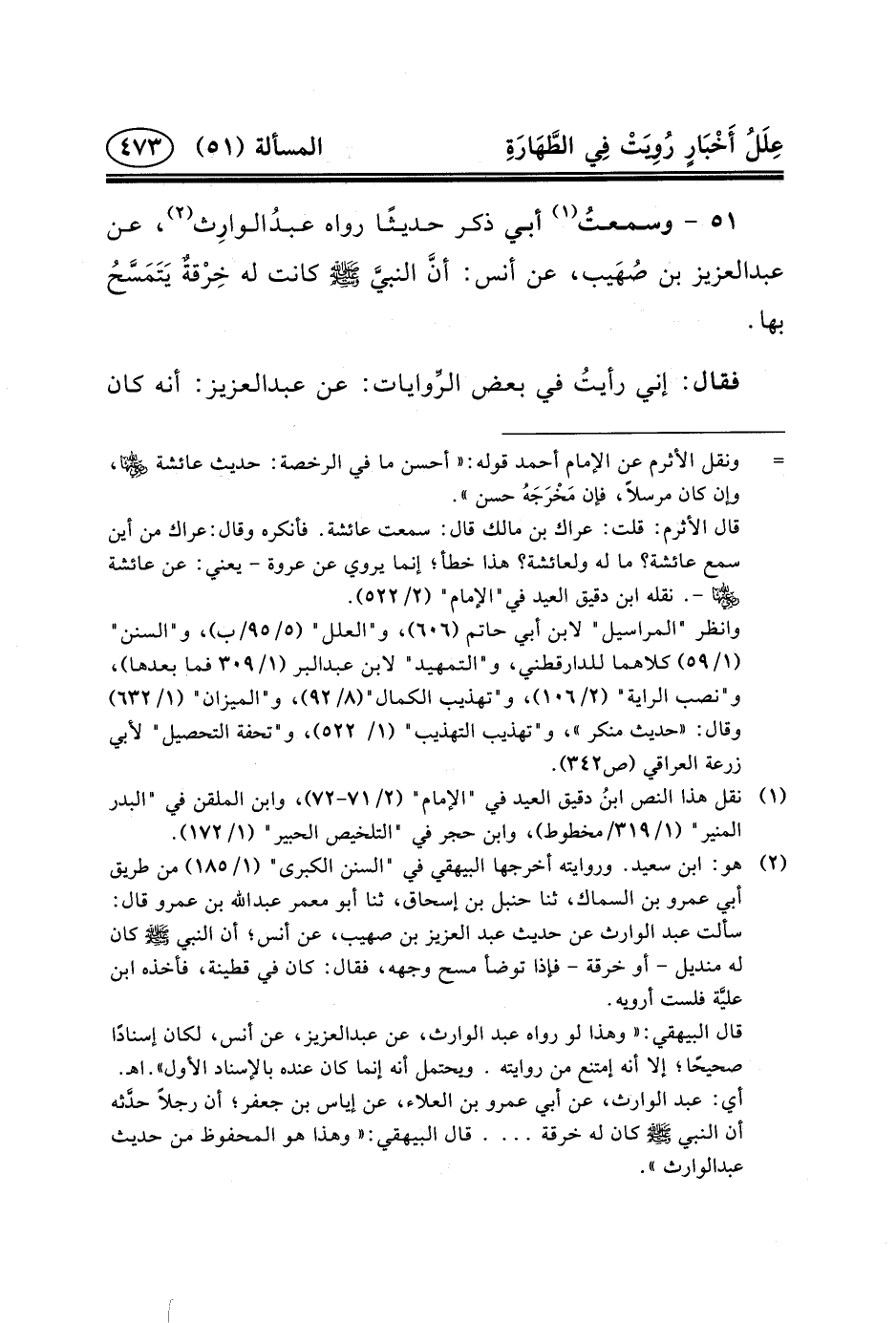 ٥١ - وسمعتُ (١) أَبِي ذَكَرَ حَدِيثًا رَوَاهُ عبدُالوارِث (٢) ، عن عبد العزيز بْنِ صُهَيب، عَنْ أَنَسٍ: أنَّ النبيَّ (ص) كَانَتْ لَهُ خِرْقةٌ يَتَمَسَّحُ بِهَا.