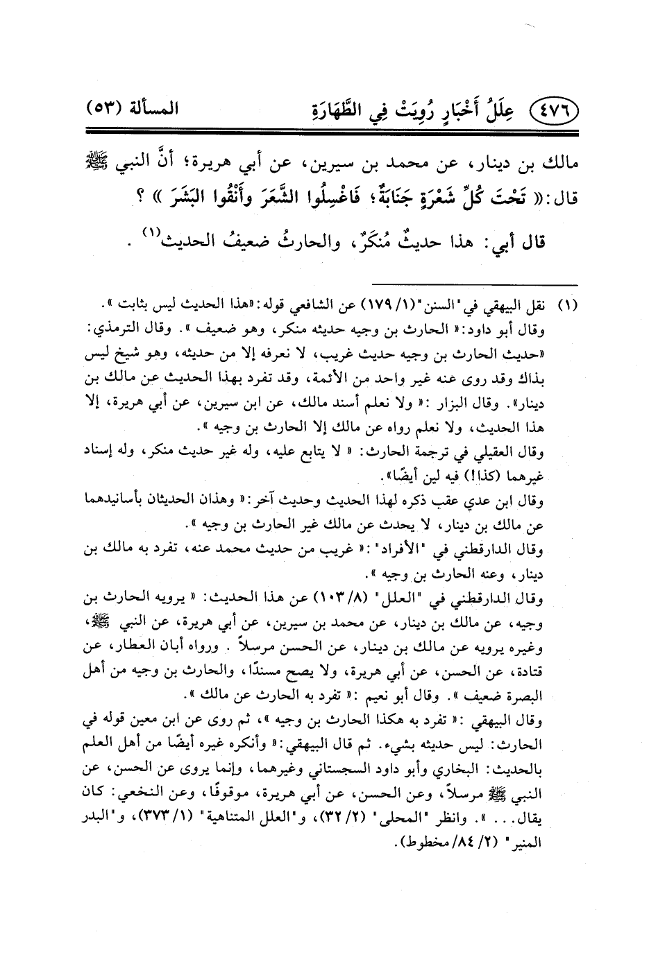 مَالِكِ بْنِ دِينَارٍ، عَنْ مُحَمَّدِ بْنِ سِيرِينَ، عَنْ أَبِي هُرَيْرَةَ؛ أنَّ النبي (ص) قَالَ: تَحْتَ كُلِّ شَعْرَةٍ جَنَابَةٌ؛ فَاغْسِلُوا الشَّعَرَ وأَنْقُوا البَشَرَ؟