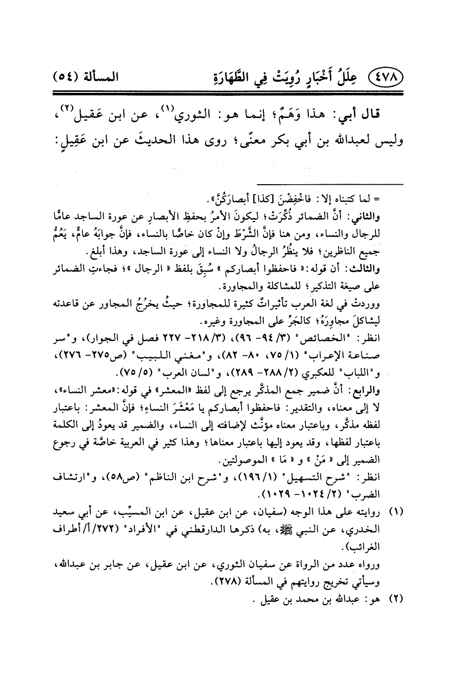 قَالَ أَبِي: هَذَا وَهَمٌ؛ إِنَّمَا هُوَ: الثَّوْرِيُّ (١) ، عَنِ ابْنِ عَقيل (٢) ، وليس لعبد الله بْنِ أَبِي بَكْرٍ مَعْنَى؛ رَوَى هَذَا الحديثَ عَنِ ابْنِ عَقِيلٍ: