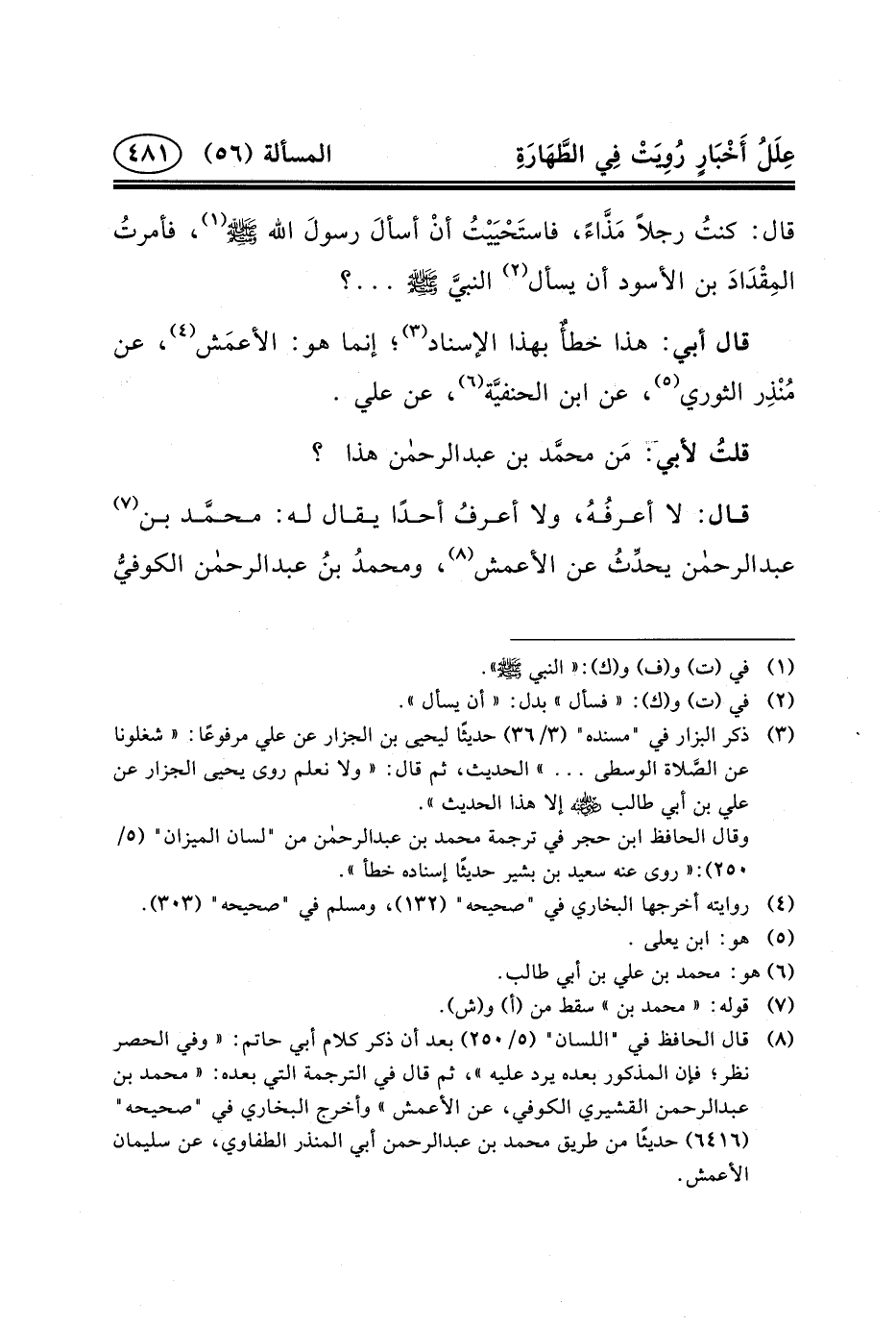 قَالَ: لا أعرفُهُ، ولا أعرفُ أحدًا يُقالُ لَهُ: محمَّد بن (٧) عبد الرحمن يحدِّثُ عَن الأعمش (٨) ، ومحمدُ بنُ عبد الرحمن الكوفيُّ