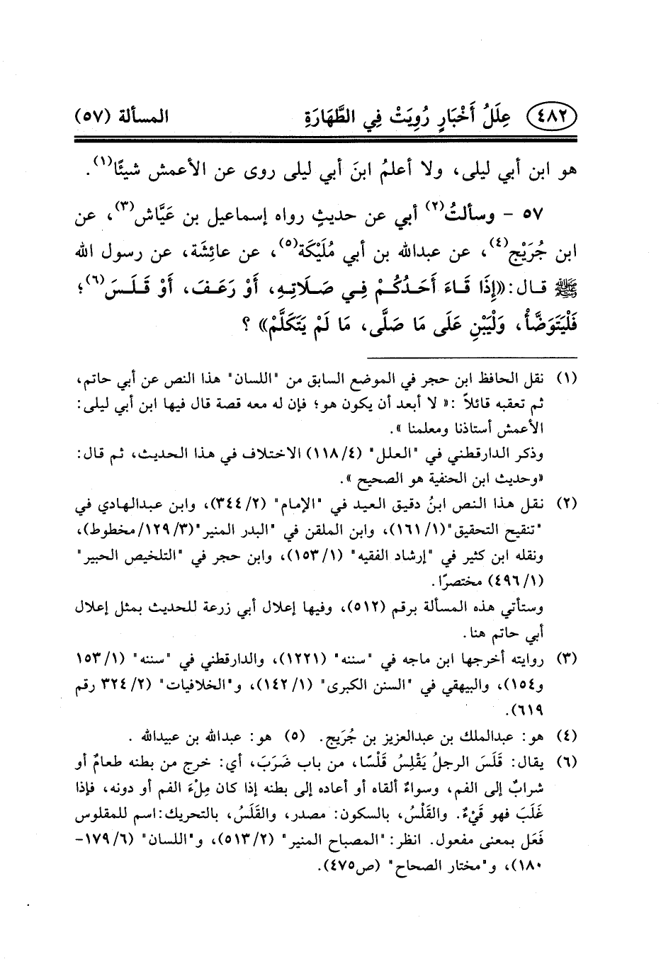 أَبِي عَن حديثٍ رَوَاهُ إِسْمَاعِيلُ بْنُ عَيَّاش (٣) ، عَنِ ابْنِ جُرَيْج (٤) ، عَنْ عبد الله بْنِ أَبِي مُلَيْكَة (٥) ، عَنْ عائِشَة، عن رسول الله (ص) قَالَ: إِذَا قَاءَ أَحَدُكُمْ فِي صَلَاتِهِ، أَوْ رَعَفَ، أَوْ قَلَسَ (٦) ؛ فَلْيَتَوَضَّأْ، وَلْيَبْنِ عَلَى مَا صَلَّى، مَا لَمْ يَتَكَلَّمْ؟