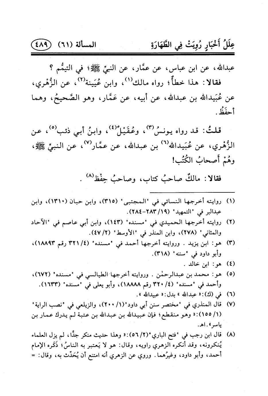 قلتُ: قد رَوَاهُ يونسُ (٣) ، وعُقَيْلٌ (٤) ، وابنُ أَبِي ذئب (٥) ، عن الزُّهْري، عن عُبَيدالله (٦) بن عبد الله، عن عمَّار (٧) ، عن النبيِّ (ص) ، وهُمْ أَصحابُ الكُتُب!