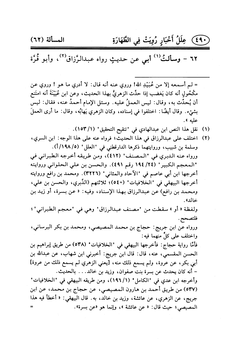 ٦٢ - وسألتُ (١) أَبِي عَنْ حديثٍ رَوَاهُ عبد الرَّزاق (٢) ،