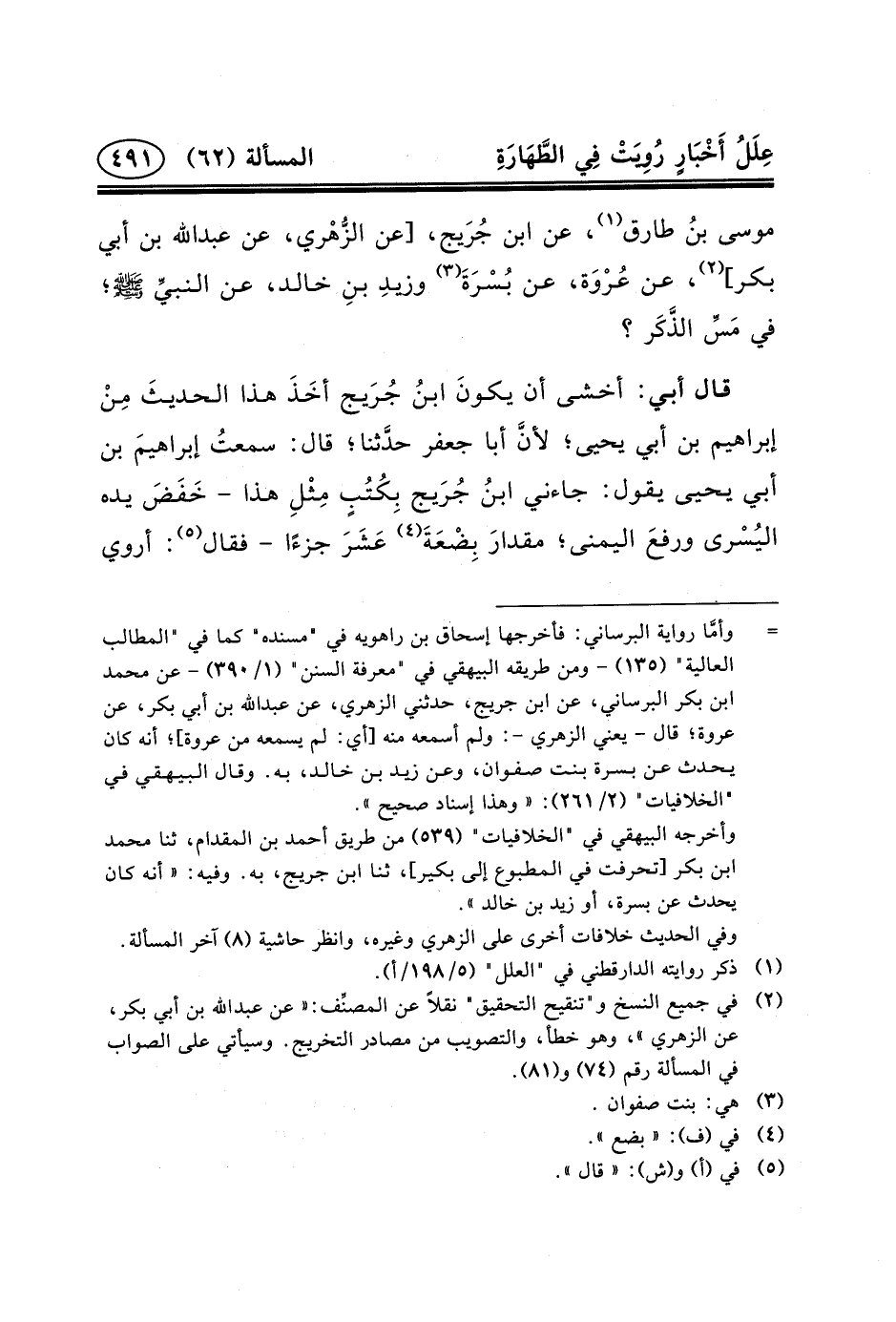 موسى بنُ طارق (١) ، عَنِ ابْنِ جُرَيج، [عن الزُّهْري، عن عبد الله بْنِ أَبِي بَكْرٍ] (٢) ، عَنْ عُرْوَة، عَن بُسْرَةَ (٣) وزيدِ بنِ خَالِدٍ، عن النبيِّ (ص) ؛ فِي مَسِّ الذَّكَر؟