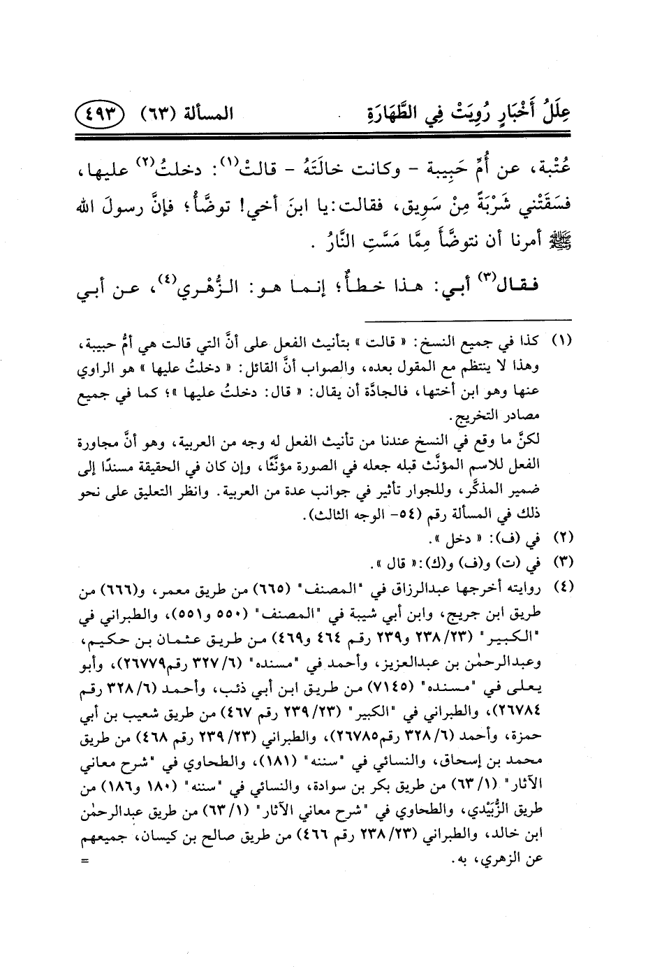 (٤) روايته أخرجها عبد الرزاق في "المصنف" (٦٦٥) من طريق معمر، و (٦٦٦) من طريق ابن جريج، وابن أبي شيبة في "المصنف" (٥٥٠ و٥٥١) ، والطبراني في "الكبير" (٢٣/٢٣٨ و٢٣٩ رقم ٤٦٤ و٤٦٩) من طريق عثمان بن حكيم، وعبد الرحمن بن عبد العزيز، وأحمد في "مسنده" (٦/٣٢٧ رقم٢٦٧٧٩) ، وأبو يعلى في "مسنده" (٧١٤٥) من طريق ابن أبي ذئب، وأحمد (٦/٣٢٨ رقم ٢٦٧٨٤) ، والطبراني في "الكبير" (٢٣/٢٣٩ رقم ٤٦٧) من طريق شعيب بن أبي حمزة، وأحمد (٦/٣٢٨ رقم٢٦٧٨٥) ، والطبراني (٢٣/٢٣٩ رقم ٤٦٨) من طريق محمد بن إسحاق، والنسائي في "سننه" (١٨١) ، والطحاوي في "شرح معاني الآثار" (١/٦٣) من طريق بكر بن سوادة، والنسائي في "سننه" (١٨٠ و١٨٦) من طريق الزُّبَيْدي، والطحاوي في "شرح معاني الآثار" (١/٦٣) من طريق عبد الرحمن بن خالد، والطبراني (٢٣/٢٣٨ رقم ٤٦٦) من طريق صالح بن كيسان، جميعهم عن الزهري، به.