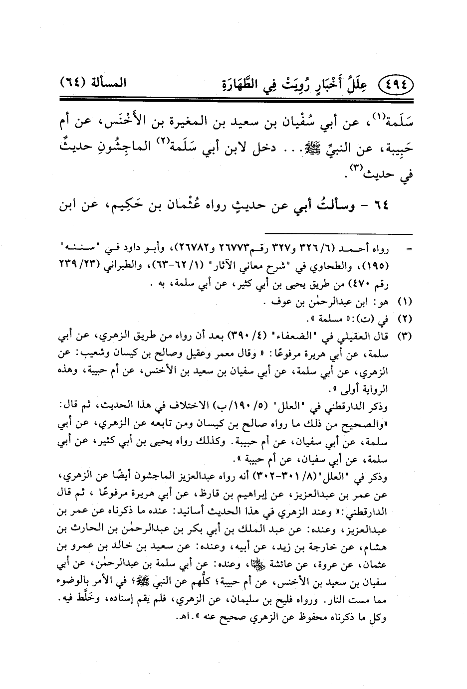 وذكر الدارقطني في "العلل" (٥/١٩٠/ب) الاختلاف في هذا الحديث، ثم قال: «والصحيح من ذلك ما رواه صالح بن كيسان ومن تابعه عَنِ الزُّهْرِيِّ، عَنْ أَبِي سَلَمَةَ، عن أبي سفيان، عن أم حبيبة. وكذلك رَوَاهُ يَحْيَى بْنُ أَبِي كَثِيرٍ، عَنْ أَبِي سَلَمَةَ، عَنْ أَبِي سفيان، عن أم حبيبة» .