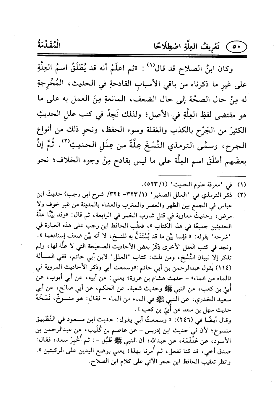 وكان ابنُ الصلاح قد قال (١) : «ثم اعلَمْ أنه قد يُطْلَقُ اسمُ العِلَّةِ على غيرِ ما ذكرناه من باقي الأسبابِ القادحةِ في الحديث، المُخْرِجةِ له مِنْ حال الصحَّة إلى حال الضعف، المانعةِ مِنَ العمل به على ما هو مقتضى لفظِ العِلَّةِ في الأصل؛ ولذلك نَجِدُ في كتب عللِ الحديثِ الكثيرَ من الجَرْح بالكذب والغفلة وسوء الحفظ، ونحوِ ذلك من أنواع الجرح، وسمَّى الترمذي النَّسْخَ عِلَّةً من عِلَلِ الحديثِ (٢) .
