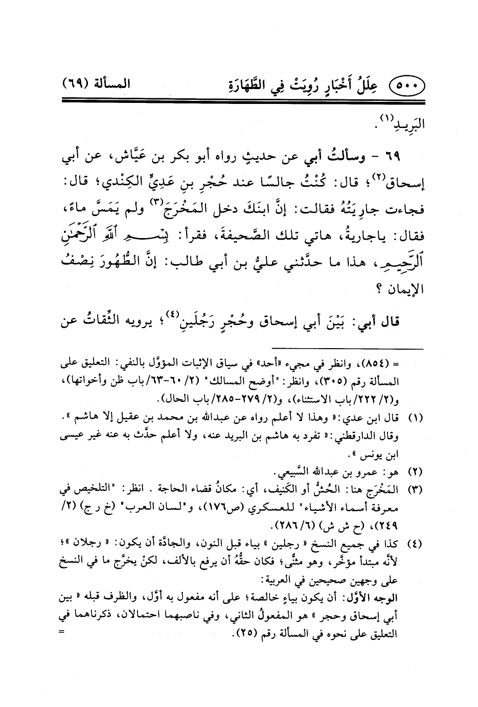 ٦٩ - وسألتُ أَبِي عَنْ حديثٍ رواه أبو بكر ابن عَيَّاش، عَنْ أَبِي إِسْحَاقَ (٢) ؛ قَالَ: كُنْتُ جَالِسًا عِنْدَ حُجْرِ بنِ عَدِيٍّ الكِنْدي؛ قال: فجاءت جارِ يَتُهُ فَقَالَتْ: إنَّ ابنَكَ دَخَلَ المَخْرَجَ (٣) ولم يَمَسَّ ماءً، فقال: ياجاريةُ، هاتي تلك الصَّحيفةَ، فقرأ: £! "، هَذَا مَا حدَّثني عليُّ بْنُ أَبِي طَالِبٍ: إنَّ الطُّهُورَ نِصْفُ الإِيمَانِ؟