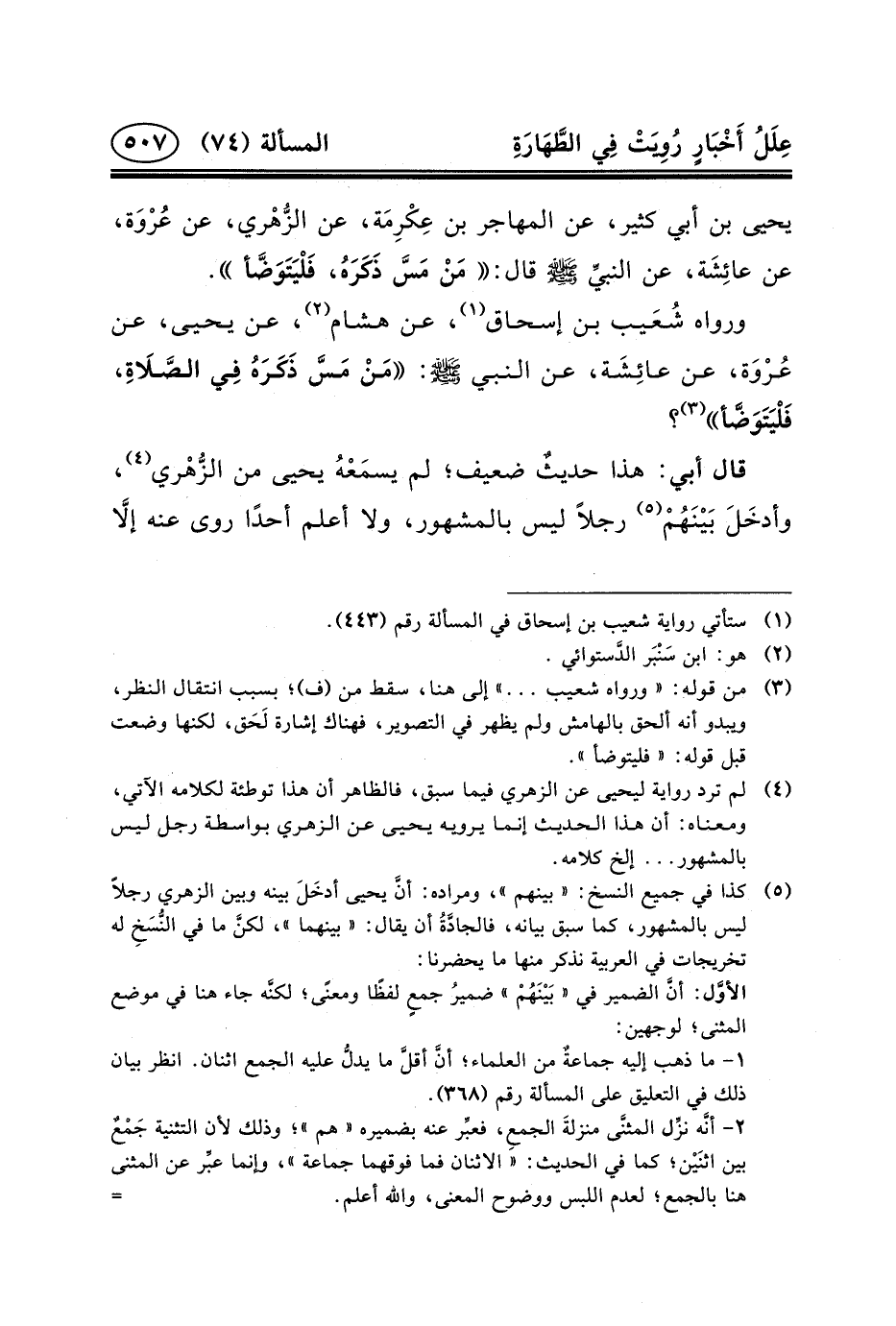 يَحْيَى بْنِ أَبِي كَثِيرٍ، عَنْ الْمُهَاجِرِ بْنِ عِكْرِمَة، عَنِ الزُّهْري، عَنْ عُرْوَة، عَنْ عائِشَة، عَنِ النبيِّ (ص) قَالَ: مَنْ مَسَّ ذَكَرَهُ، فَلْيَتَوَضَّأ.