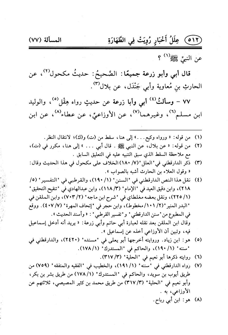 (٧) رواه الدارقطني في "سننه" (١/١٩١) ، والخطيب في "الفقيه والمتفقه" (٧٥٩) من طريق أيوب بن سويد، والحاكم في "المستدرك" (١/١٧٨) من طريق بشر بن بكر، وأبو نعيم في "الحلية" (٣/٣١٧) من طريق محمد بن كثير المصيصي، ثلاثتهم عن الأوزاعي، به.