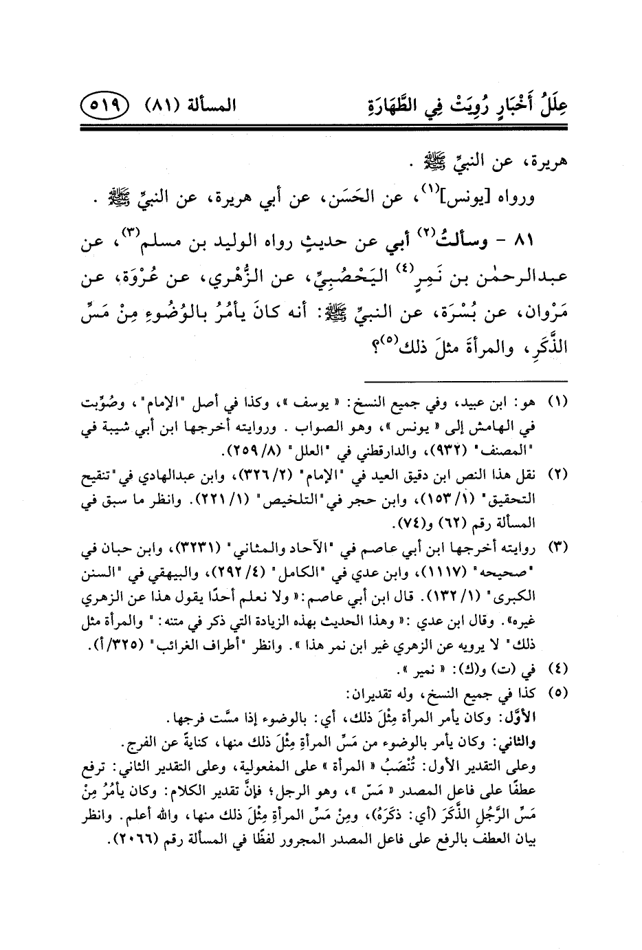 ٨١ - وسألتُ (٢) أَبِي عَنْ حديثٍ رَوَاهُ الوليد بن مسلم (٣) ، عن عبد الرحمن بْنِ نَمِرٍ (٤) اليَحْصُبِيِّ، عَنِ الزُّهْري، عَنْ عُرْوَة، عَنْ مَرْوان، عَنْ بُسْرَة، عن النبيِّ (ص) : أَنَّهُ كانَ يأمُرُ بالوُضُوءِ مِنْ مَسِّ الذَّكَرِ، والمرأةَ مثلَ ذَلِكَ (٥) ؟