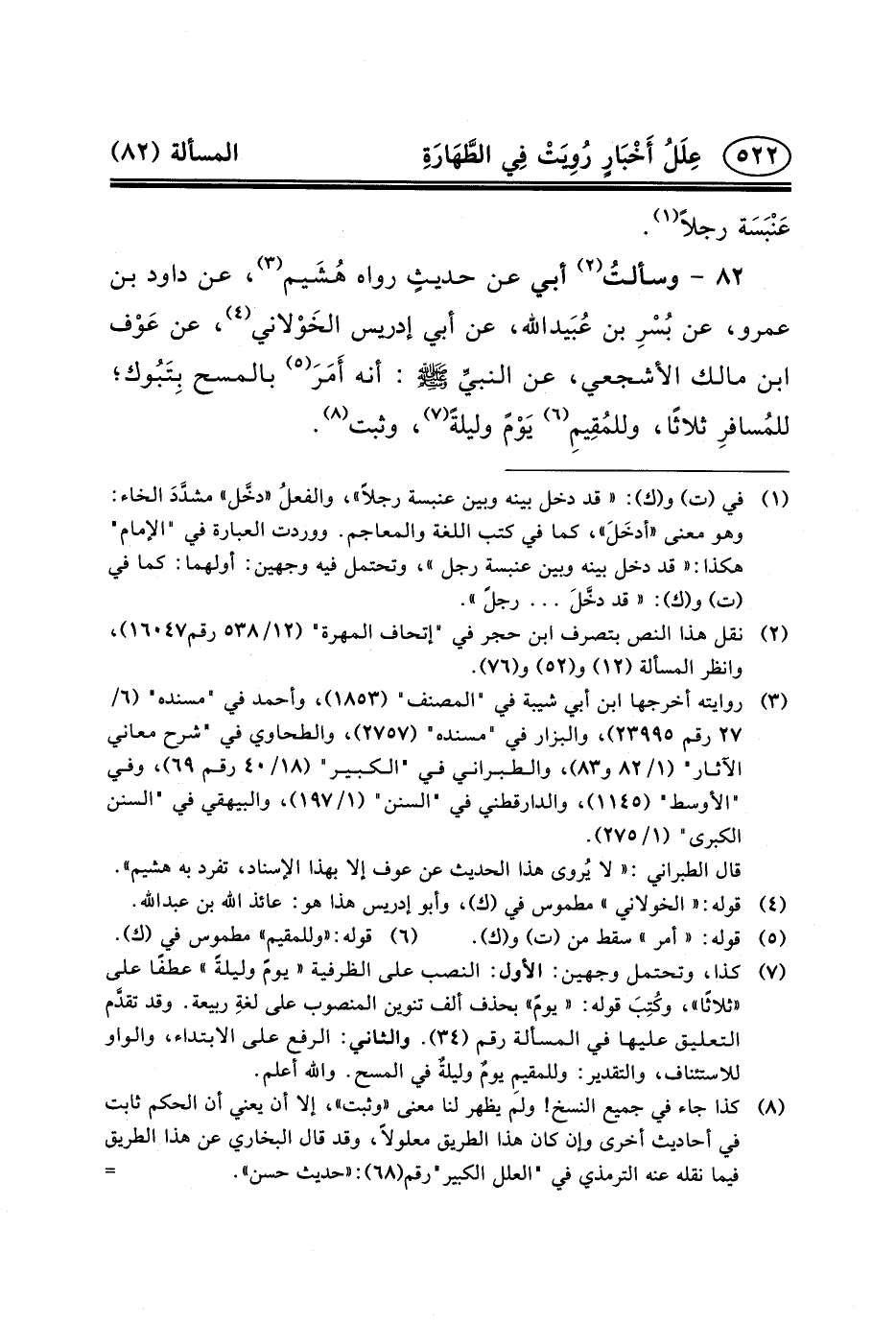 عَنْ دَاوُدَ بْنِ عَمْرٍو، عَنْ بُسْرِ بْنِ عُبَيدالله، عَنْ أَبِي إِدْرِيسَ الخَوْلاني (٤) ، عَنْ عَوْف بْنِ مَالِكٍ الأَشْجَعِيِّ، عَنِ النبيِّ (ص) : أَنَّهُ أَمَرَ (٥) بِالْمَسْحِ بِتَبُوك؛ للمُسافرِ ثَلاثًا، وللمُقِيمِ (٦) يَوْمً وَلَيْلَةٌ (٧) ، وَثَبَتَ (٨) .
