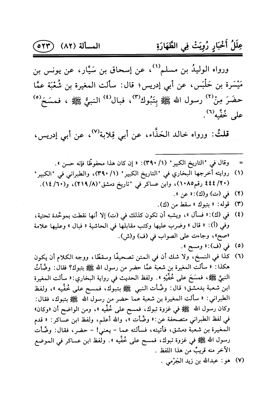 وَرَوَاهُ الوليدُ بْنُ مُسْلِمٍ (١) ، عَنْ إِسْحَاقَ بْنِ سَيَّار، عَنْ يُونُسَ بْنِ مَيْسَرة بْنِ حَلْبَس، عَنْ أَبِي إِدْرِيسَ؛ قَالَ: سَأَلْتُ الْمُغِيرَةَ بن شُعْبَة عمَّا حضَرَ مِنْ (٢) رسول الله (ص) بِتَبُوك (٣) ، فبال (٤) النبيُّ (ص) ، فمسَحَ (٥) عَلَى خُفَّيه (٦) .