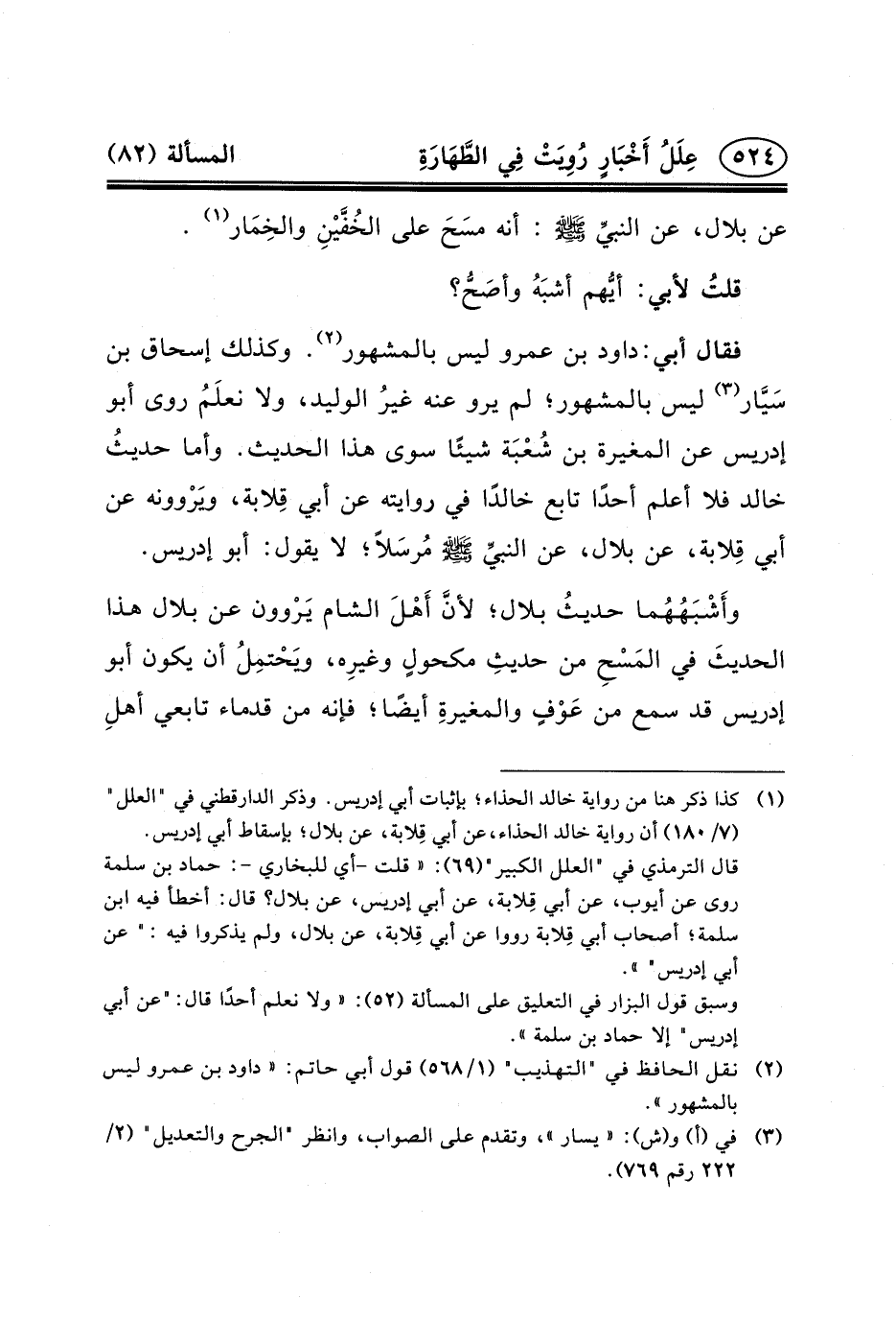 فَقَالَ أَبِي: دَاوُد بْنُ عَمْرٍو لَيْسَ بِالْمَشْهُورِ (٢) . وَكَذَلِكَ إِسْحَاقُ بْنُ سَيَّار (٣) لَيْسَ بِالْمَشْهُورِ؛ لَمْ يَرْوِ عَنْهُ غيرُ الْوَلِيدِ، وَلا نعلَمُ رَوَى أَبُو إِدْرِيسَ عَنِ الْمُغِيرَةِ بْنِ شُعْبَة شَيْئًا سِوَى هَذَا الْحَدِيثَ. وَأَمَّا حديثُ خَالِدٍ فَلا أَعْلَمُ أَحَدًا تَابَعَ خَالِدًا فِي رِوَايَتِهِ عَنْ أَبِي قِلابة، ويَرْوونه عَنْ أَبِي قِلابة، عَنْ بِلالٍ، عن النبيِّ (ص) مُرسَلاً؛ لا يَقُولُ: أَبُو إِدْرِيسَ.