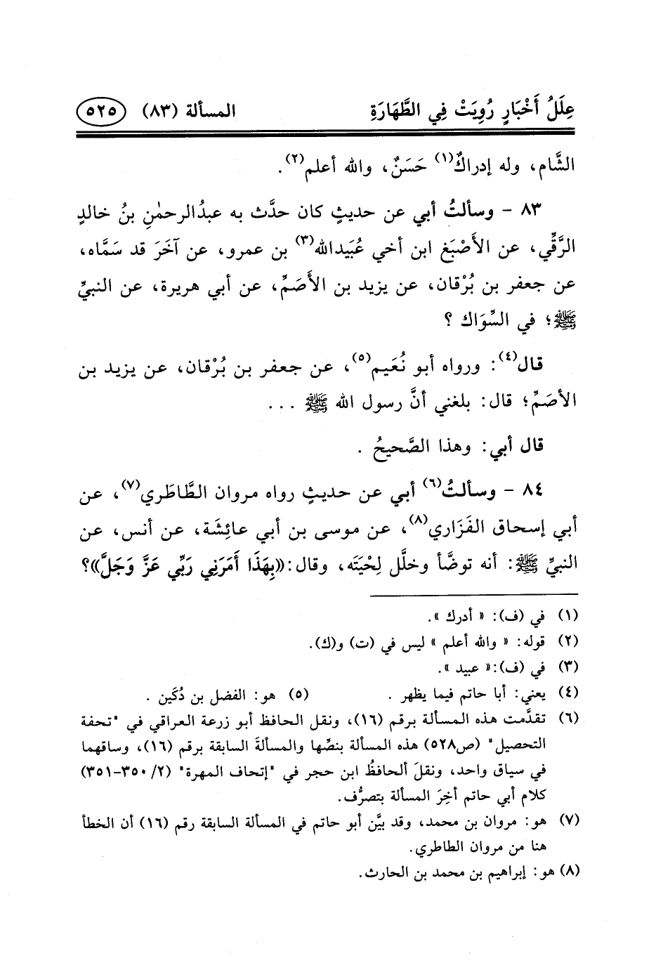 (٦) تقدَّمت هذه المسألة برقم (١٦) ، ونقل الحافظ أبو زرعة العراقي في "تحفة التحصيل" (ص٥٢٨) هذه المسألة بنصِّها والمسألةَ السابقة برقم (١٦) ، وساقهما في سياق واحد، ونقلَ ألحافظُ ابن حجر في "إتحاف المهرة" (٢/٣٥٠-٣٥١) كلام أبي حاتم أخِرَ المسألة بتصرُّف.