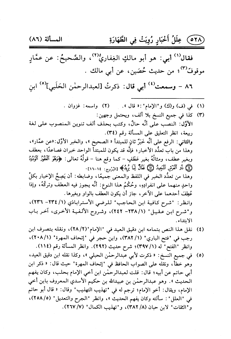 (٥) في جميع النسخ: «ذكرت لأبي عبد الرحمن الحبلي» ، وكذا نقله ابن دقيق العيد، وهو خطأ، ونقله على الصواب الحافظ في "إتحاف المهرة" حيث قال: «ذكر ابن أبي حاتم عن أبيه؛ قال: قلت لعبد الرحمن ابن أخي الإمام بحلب، وكان يفهم الحديث» . وهو عبد الرحمن بن عبيد الله بن حكيم الأسدي المعروف بابن أخي الإمام، ويقال: أخو الإمام؛ ترجم له في "تهذيب التهذيب" وقال: «قال أبو حاتم في "العلل": سألته وكان يفهم الحديث» ، وانظر "الجرح والتعديل" (٥/٢٥٨) ، و"الثقات" لابن حبان (٨/٣٨٢) ، و"تهذيب الكمال" (٧/٢٦٧) .