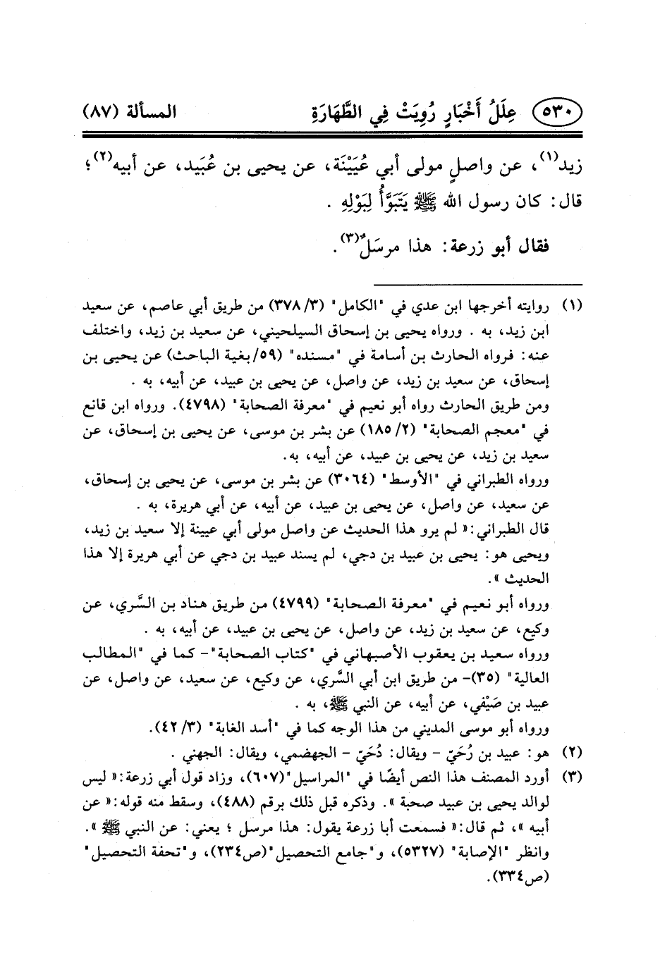 (٤) أورد المصنف هذا النص أيضًا في "المراسيل" (٦٠٧) ، وزاد قول أبي زرعة: «ليس لوالد يحيى بن عبيد صحبة» . وذكره قبل ذلك برقم (٤٨٨) ، وسقط منه قوله: «عن أبيه» ، ثم قال: «فَسَمِعْتُ أَبَا زُرْعَةَ يَقُولُ: هَذَا مرسل؛ يعني: عن النبي (ص) » . وانظر "الإصابة" (٥٣٢٧) ، و"جامع التحصيل" (ص٢٣٤) ، و"تحفة التحصيل" (ص٣٣٤) .