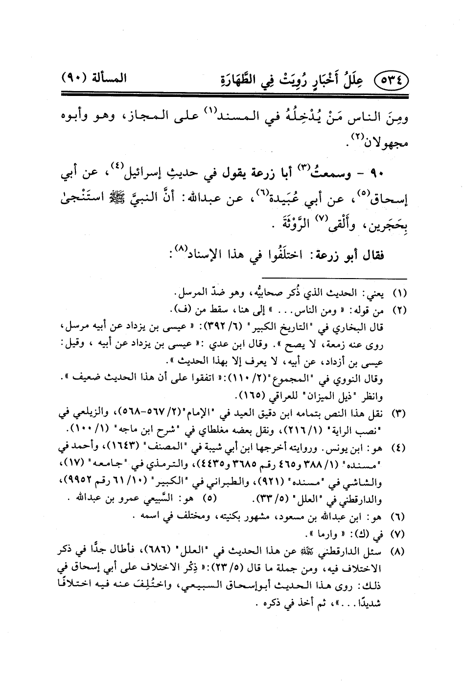 ٩٠ - وسمعتُ (٣) أَبَا زُرْعَةَ يَقُولُ فِي حديثِ إِسْرَائِيلَ (٤) ، عَنْ أَبِي إِسْحَاقَ (٥) ، عَنْ أَبِي عُبَيدة (٦) ، عَنْ عبد الله: أنَّ النبيَّ (ص) استَنْجى بِحَجَرين، وأَلْقى (٧) الرَّوْثَةَ.