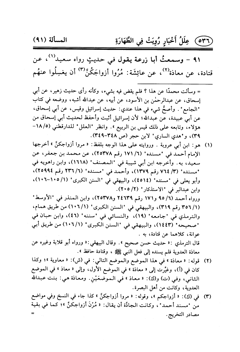 عَنْ قَتَادَةَ، عَنْ مُعَاذَةَ (٢) ، عَنْ عائِشَة: مُرُوا أزواجَكُنَّ (٣) أن يغسِلُوا عنهُم