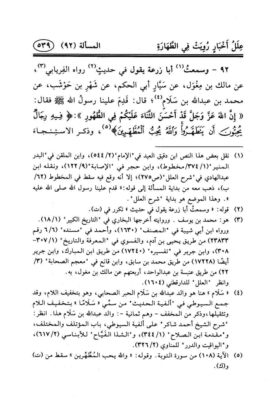 عَنْ مَالِكِ بْنِ مِغْوَل، عَنْ سَيَّارٍ أَبِي الْحَكَمِ، عَنْ شَهْرِ بْنِ حَوْشَب، عن محمد بن عبد الله بْنِ سَلَامٍ (٤) ؛ قَالَ: قَدِمَ عَلَيْنَا رسولُ الله (ص) فَقَالَ: إِنَّ اللهَ عَزَّ وَجَلَّ قَدْ أَحْسَنَ الثَّنَاءَ عَلَيْكُمْ فِي الطُّهُورِ: {} (٥) ، وذكر الاستِنجاءَ