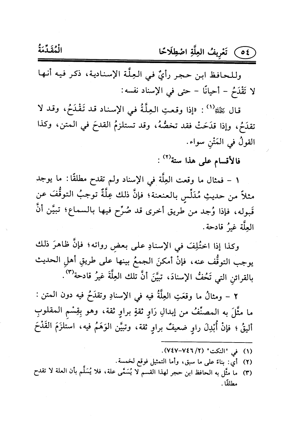 قال _ح (١) : «إذا وقعتِ العِلَّةُ في الإسناد قد تَقْدَحُ، وقد لا تقدَحُ، وإذا قدَحَتْ فقد تخصُّهُ، وقد تستلزمُ القدحَ في المتن، وكذا القولُ في المَتْنِ سواء.