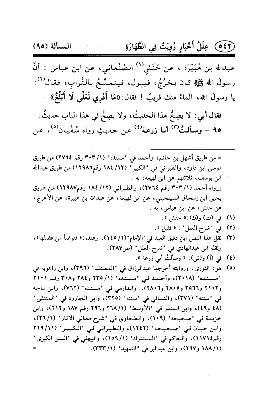 عبد الله بْنِ هُبَيْرَة، عَنْ حَنَشٍ (١) الصَّنْعاني، عَنِ ابْنِ عَبَّاسٍ: أنَّ رسولَ الله (ص) كَانَ يخرُجُ، فَيَبُولُ، فيتمسَّحُ بالتُّرابِ، فَقَالَ (٢) : يَا رسولَ اللَّهِ، الماءُ مِنْكَ قريبٌ! فَقَالَ: مَا أَدْرِي لَعَلِّي لَا أَبْلُغُ.