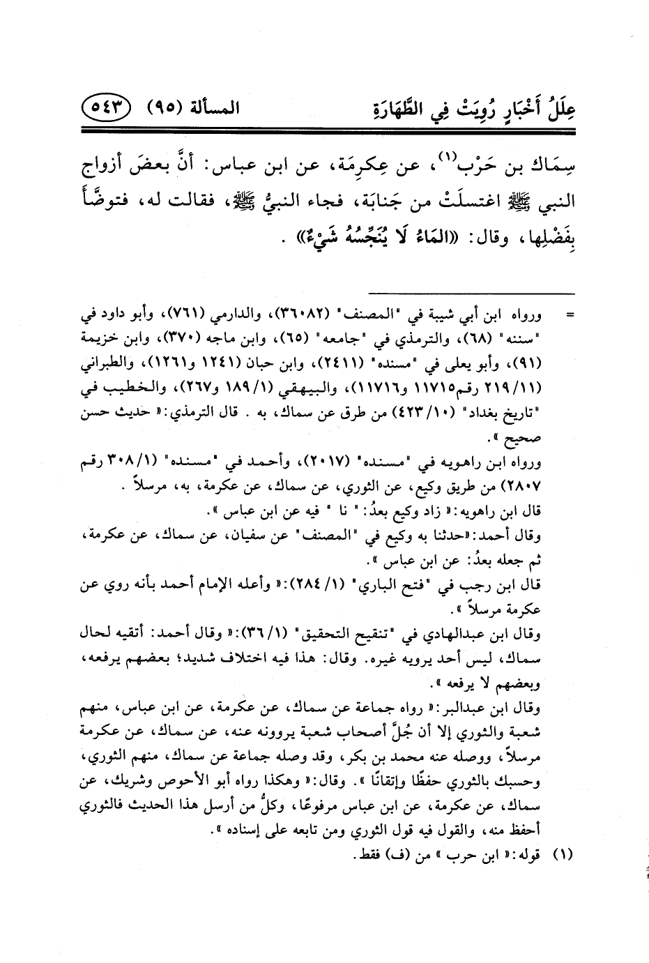 سِمَاك بن حَرْب (١) ، عَنْ عِكرِمَة، عَنِ ابْنِ عَبَّاسٍ: أنَّ بعضَ أزواج النبي (ص) اغتسلَتْ مِنْ جَنابَة، فَجَاءَ النبيُّ (ص) ، فَقَالَتْ لَهُ، فتوضَّأَ بِفَضْلِها، وَقَالَ: المَاءُ لَا يُنَجِّسُهُ شَيْءٌ.
