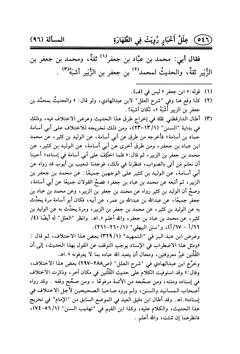 (٢) كذا وقع هنا وفي "شرح العلل" لابن عبد الهادي، ولو قال: «والحديثُ بمحمَّد بْن جعفرِ بْن الزبير أَشْبَهُ» ، لكان أشبَهَ!.