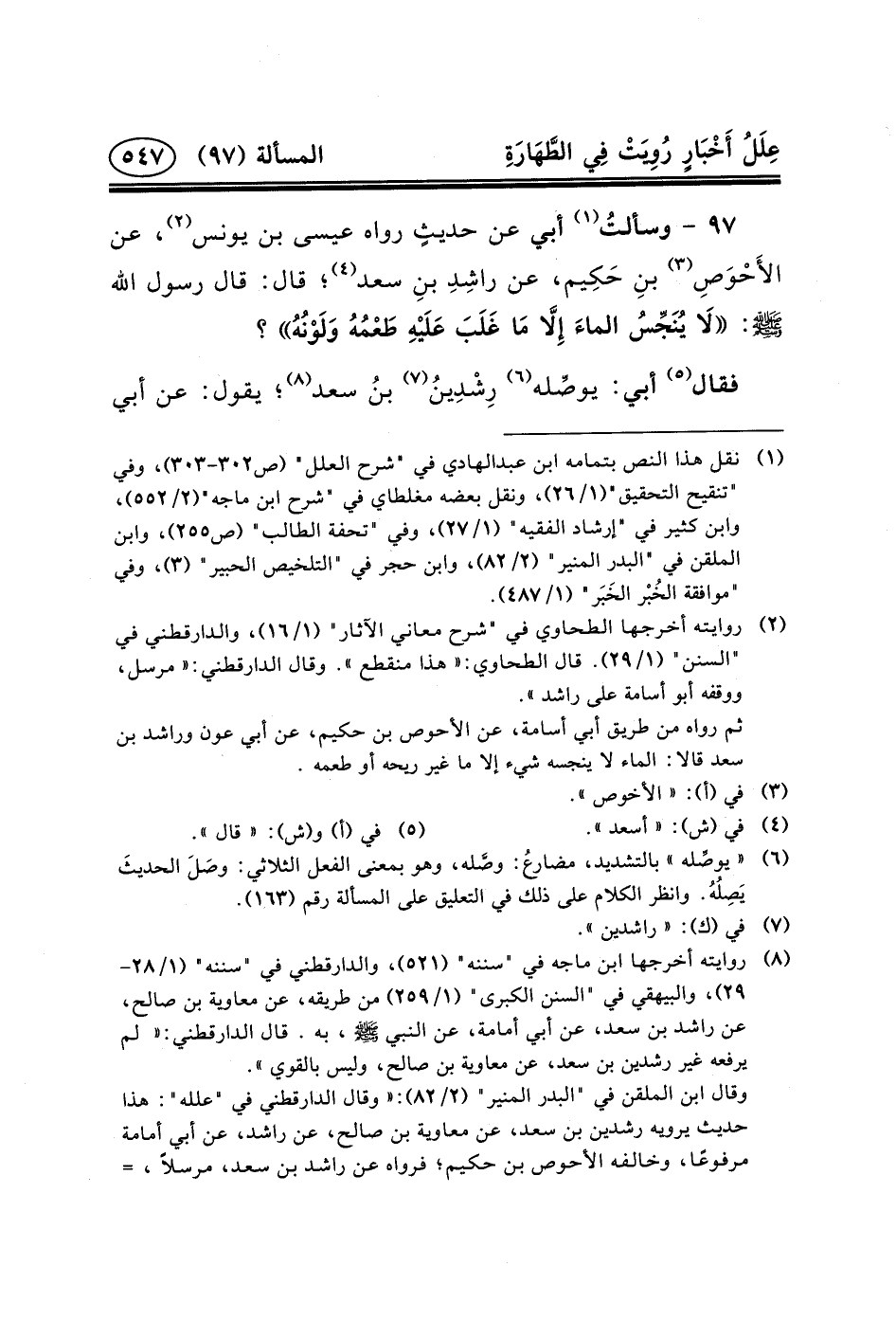 ٩٧ - وسألتُ (١) أَبِي عَنْ حديثٍ رَوَاهُ عِيسَى بْنُ يُونُسَ (٢) ، عَنِ الأَحْوَصِ (٣) بنِ حَكِيم، عَنْ راشِدِ بنِ سَعْدٍ (٤) ؛ قَالَ: قَالَ رَسُولُ اللَّهِ (ص) : لَا يُنَجِّسُ الماءَ إِلَاّ مَا غَلَبَ عَلَيْهِ طَعْمُهُ وَلَوْنُهُ؟