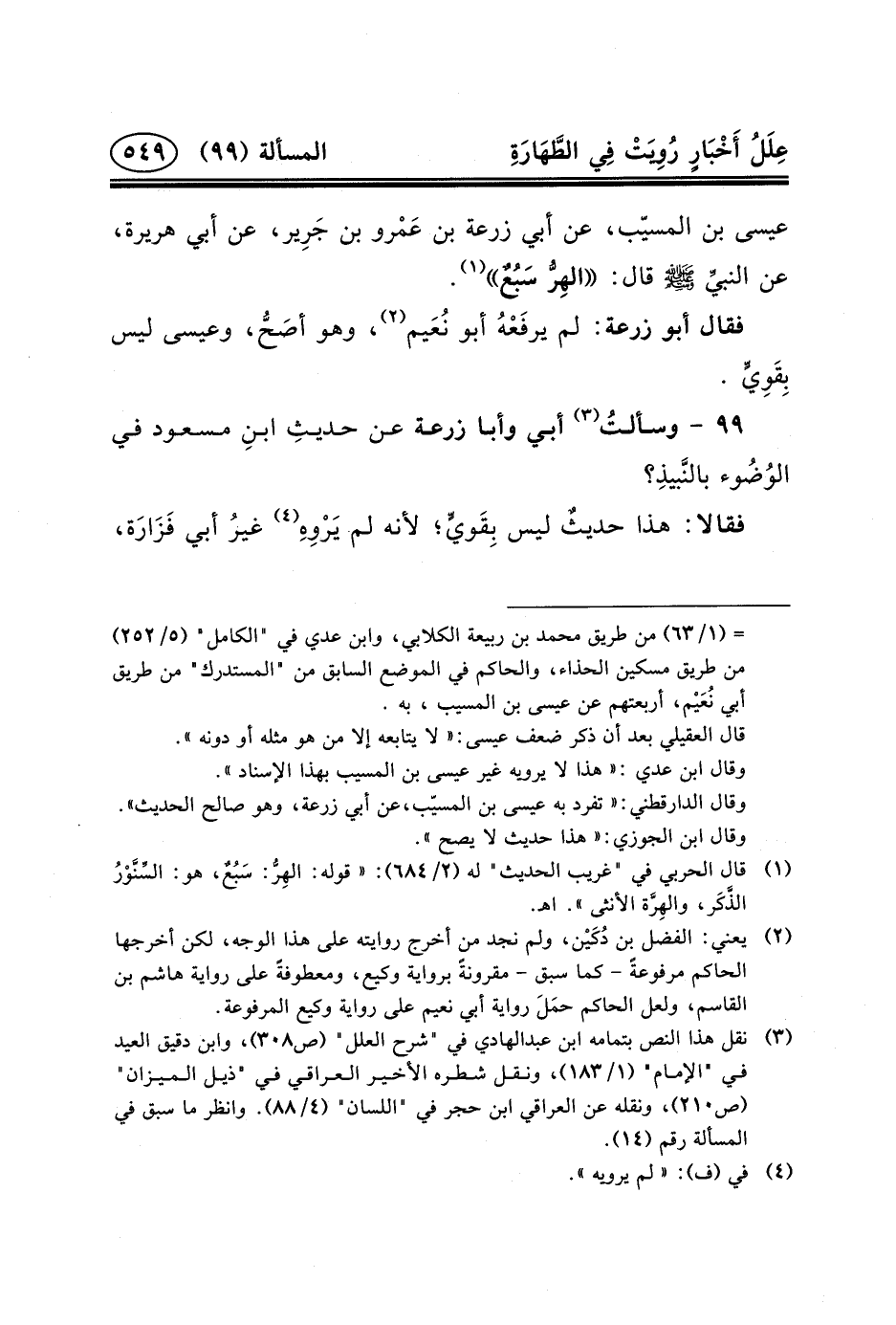 ٩٩ - وسألتُ (٣) أَبِي وَأَبَا زُرْعَةَ عَنْ حديثِ ابنِ مَسْعُودٍ فِي الوُضُوء بالنَّبيذِ؟