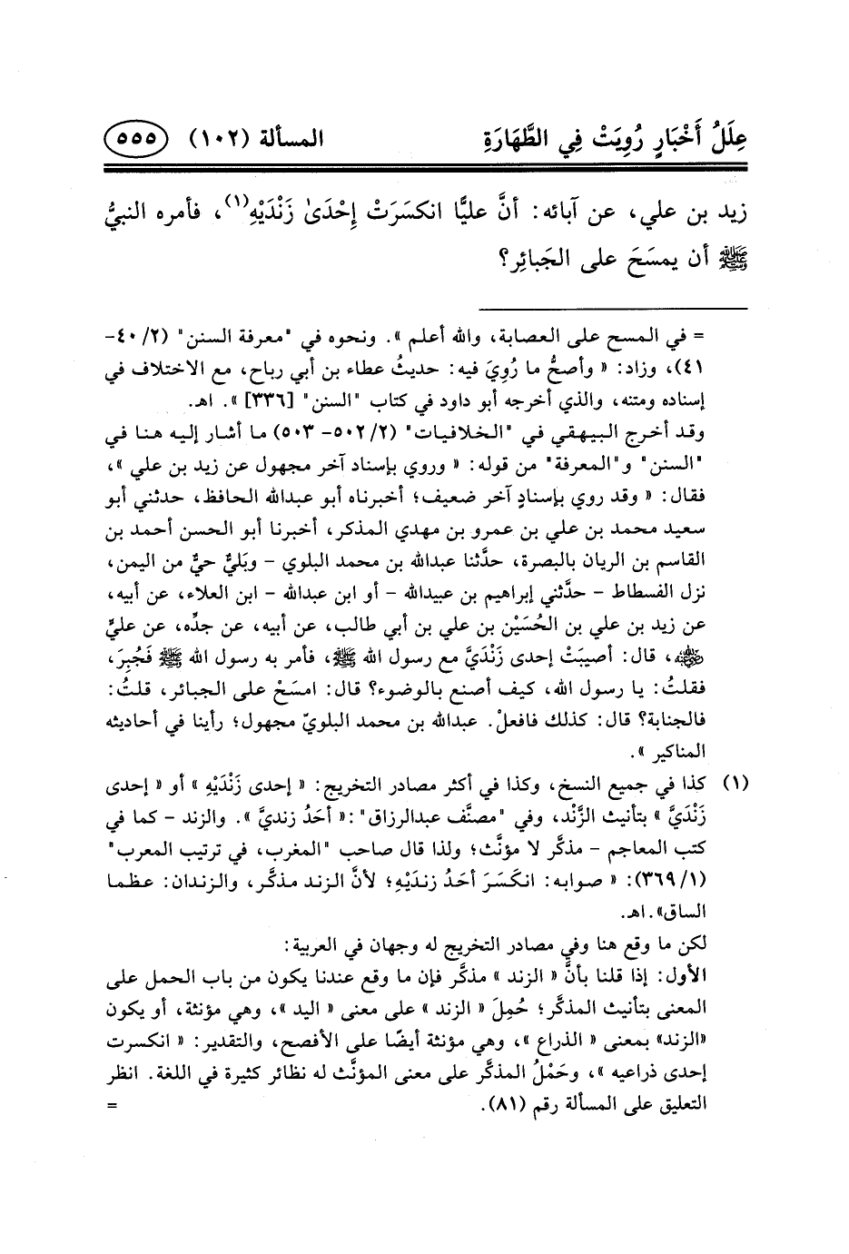 (١) كذا في جميع النسخ، وكذا في أكثر مصادر التخريج: «إحدى زَنْدَيْهِ» أو «إحدى زَنْدَيَّ» بتأنيث الزَّنْد، وفي "مصنَّف عبد الرزاق": «أحَدُ زنديَّ» . والزند - كما في كتب المعاجم - مذكَّر لا مؤنَّث؛ ولذا قال صاحب "المغرب، في ترتيب المعرب" (١/٣٦٩) : «صوابه: انكَسَرَ أحَدُ زندَيْهِ؛ لأنَّ الزند مذكَّر، والزندان: عظما الساق» . اهـ.