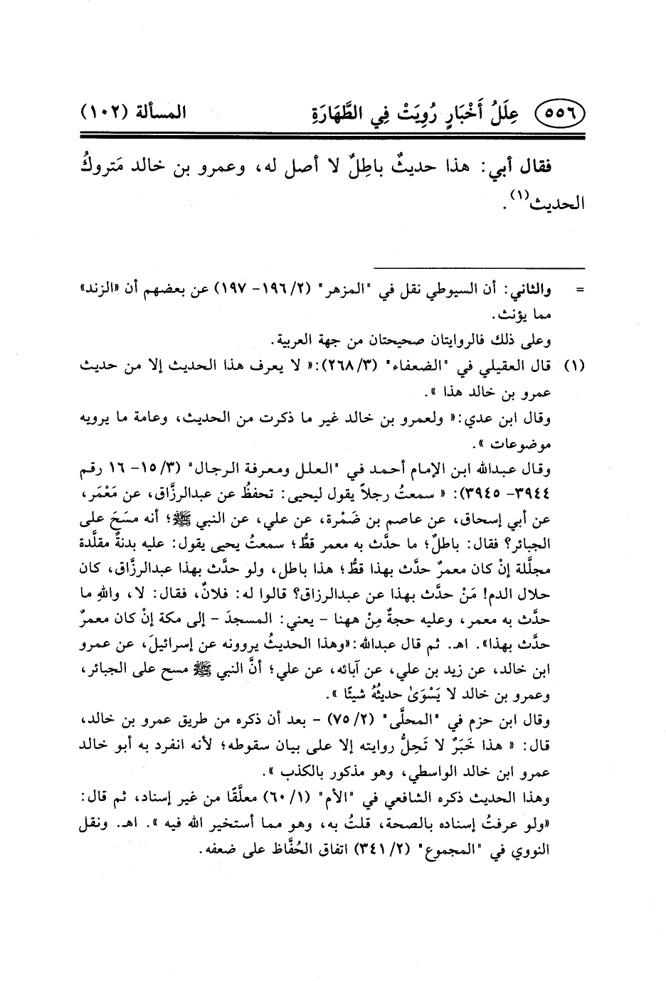وقال عبد الله ابن الإمام أحمد في "العلل ومعرفة الرجال" (٣/١٥- ١٦ رقم ٣٩٤٤- ٣٩٤٥) : «سمعتُ رجلاً يقول ليحيى: تحفظُ عن عبد الرزَّاق، عَنْ مَعْمَر، عَنْ أَبِي إِسْحَاقَ، عَنْ عَاصِمِ بْنِ ضَمْرة، عَنْ علي، عن النبي (ص) ؛ أنه مسَحَ على الجبائر؟ فقال: باطلٌ؛ ما حدَّث به معمر قطُّ؛ سمعتُ يحيى يقول: عليه بدنةٌ مقلَّدة مجلَّلة إنْ كان معمرٌ حدَّث بهذا قطُّ؛ هذا باطل، ولو حدَّث بهذا عبد الرزَّاق، كان حلال الدم! مَنْ حدَّث بهذا عن عبد الرزاق؟ قالوا له: فلانٌ، فقال: لا، واللهِ ما حدَّث به معمر، وعليه حجةٌ مِنْ ههنا - يعني: المسجدَ - إلى مكة إنْ كان معمرٌ حدَّث بهذا» . اهـ. ثم قال عبد الله: «وهذا الحديثُ يروونه عن إسرائيلَ، عَنْ عَمْرو بْن خَالِد، عَنْ زَيْدِ بْنِ عَلِيٍّ، عَن آبائه، عن علي؛ أنَّ النبي (ص) مسح على الجبائر، وعمرو بن خالد لا يَسْوَى حديثُهُ شيئًا» .