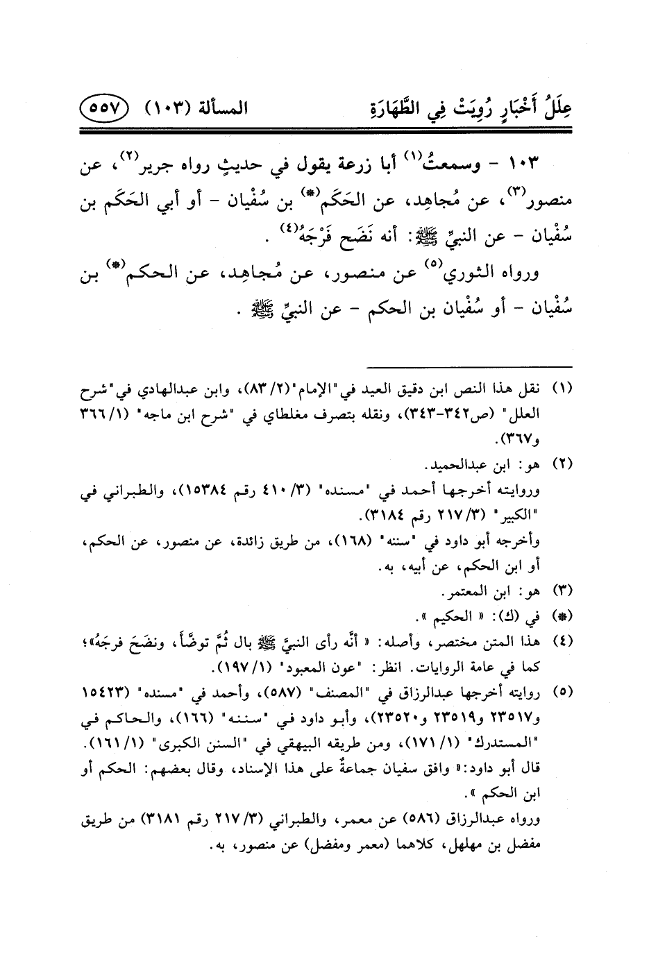 ١٠٣ - وسمعتُ (١) أَبَا زُرْعَةَ يَقُولُ فِي حديثٍ رَوَاهُ جَرِيرٌ (٢) ، عَنْ مَنْصُورٍ (٣) ، عَنْ مُجاهِد، عَنِ الحَكَم (*) بْنِ سُفْيان - أَوْ أَبِي الحَكَم بْنِ سُفْيان - عن النبيِّ (ص) : أَنَّهُ نَضَح فَرْجَهُ (٤) .