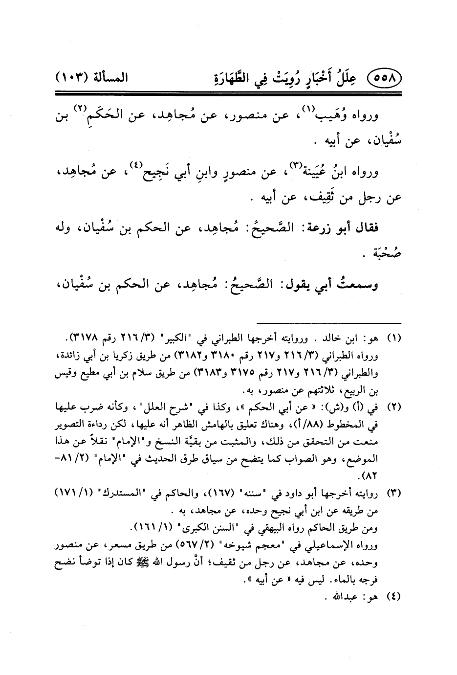 ورواه الإسماعيلي في "معجم شيوخه" (٢/٥٦٧) من طريق مسعر، عن منصور وحده، عَنْ مُجَاهِدٍ، عَن رَجُلٍ مِنْ ثقيف؛ أنَّ رسول الله (ص) كان إذا توضأ نضح فرجه بالماء. ليس فيه «عن أبيه» .