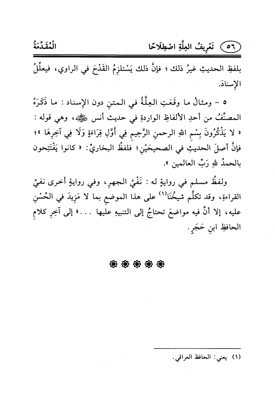 ٥ - ومثالُ ما وقَعَتِ العِلَّةُ في المتنِ دون الإِسناد: ما ذَكَرَهُ المصنِّفُ من أحدِ الألفاظِ الواردةِ في حديث أنس ح، وهي قوله: «لا يَذْكُرُونَ بِسْمِ اللهِ الرحمنِ الرَّحِيمِ فِي أَوَّلِ قِرَاءَةٍ وَلَا فِي آخِرِهَا» ؛ فإنَّ أصلَ الحديثِ في الصحيحَيْنِ؛ فلفظُ البخاريِّ: «كانوا يَفْتَتِحون بالحمدُ للهِ رَبِّ العالمين» .