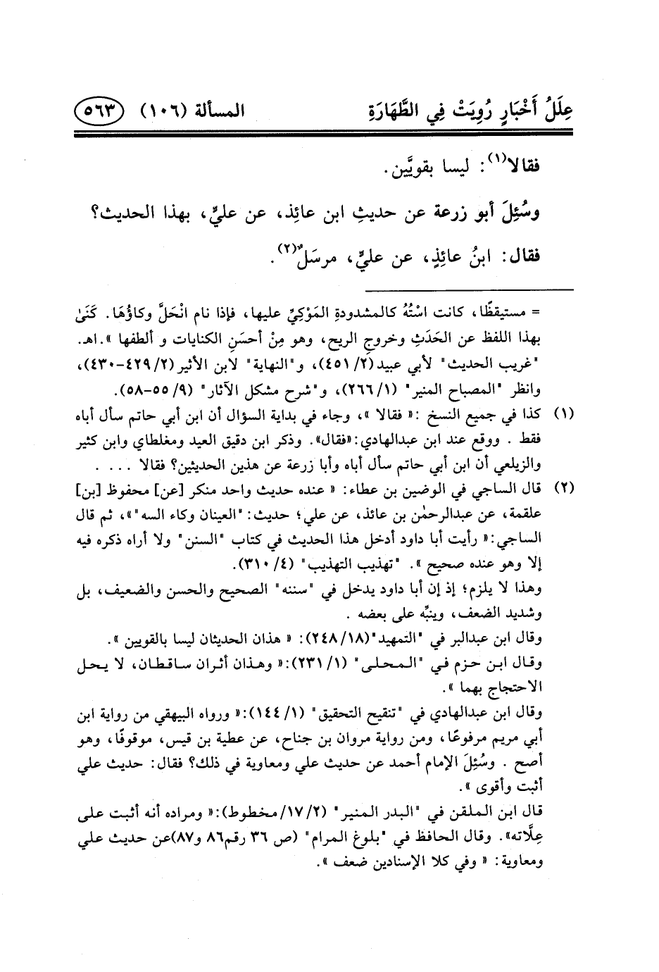 (١) كذا في جميع النسخ: «فقالا» ، وجاء في بداية السؤال أن ابن أبي حاتم سأل أباه فقط. ووقع عند ابن عبد الهادي: «فقال» . وذكر ابن دقيق العيد ومغلطاي وابن كثير والزيلعي أن ابن أبي حاتم سأل أباه وأبا زرعة عن هذين الحديثين؟ فقالا ... .