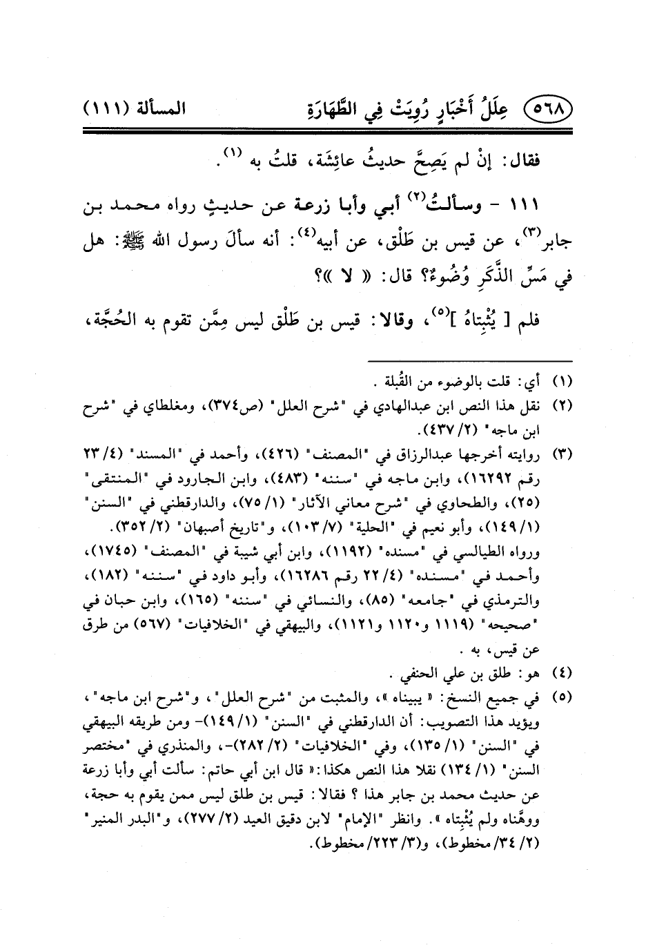 ١١١ - وسألتُ (٢) أَبِي وَأَبَا زُرْعَةَ عَنْ حديثٍ رَوَاهُ مُحَمَّدُ بْنُ جَابِرٍ (٣) ، عَن قيس بْن طَلْق، عَنْ أَبِيهِ (٤) : أَنَّهُ سألَ رسول الله (ص) : هَلْ فِي مَسِّ الذَّكَرِ وُضُوءٌ؟ قَالَ: لا؟