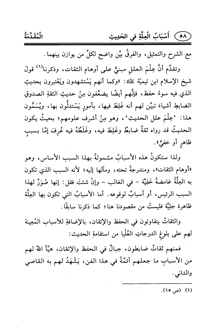 وتقدَّم أنَّ عِلْمَ العللِ مبنيٌّ على أوهام الثقات، وذكرنا (١) قولَ شيخ الإسلام ابن تيميّة _ح: «وكما أنهم يَسْتشهدون ويَعْتبرون بحديثِ الذي فيه سوءُ حفظ، فإنَّهم أيضًا يضعِّفون مِنْ حديثِ الثقةِ الصدوقِ الضابطِ أشياءَ تبيَّن لهم أنه غَلِطَ فيها، بأمورٍ يَسْتدلُّون بها، ويُسَمُّون هذا: "عِلْمَ علل الحديث"، وهو مِنْ أشرف علومهم؛ بحيثُ يكون الحديثُ قد رواه ثقةٌ ضابطٌ وغَلِطَ فيه، وغَلَطُهُ فيه عُرِفَ إمَّا بسببٍ ظاهرٍ أو خفيٍّ» .