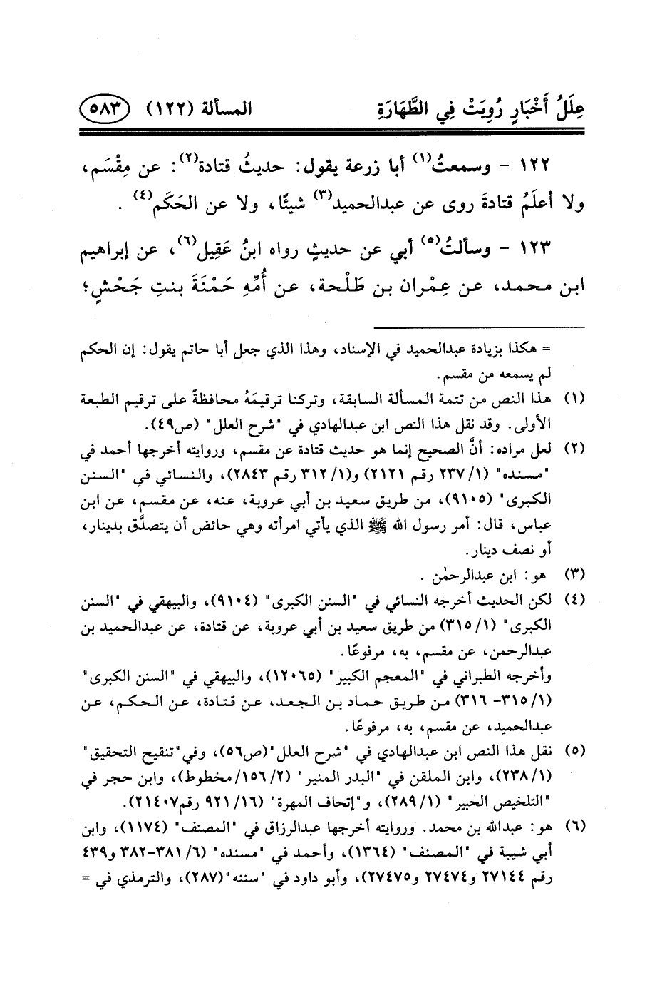 (١) هذا النص من تتمة المسألة السابقة، وتركنا ترقيمَهُ محافظةً على ترقيم الطبعة الأولى. وقد نقل هذا النص ابن عبد الهادي في "شرح العلل" (ص٤٩) .