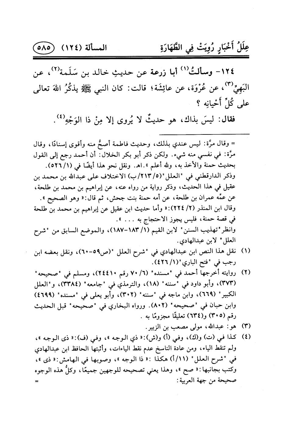 ١٢٤- وسألتُ (١) أَبَا زُرْعَةَ عَنْ حديثِ خَالِد بْن سَلَمة (٢) ، عَنِ البَهِيِّ (٣) ، عَنْ عُرْوَة، عَنْ عائِشَة؛ قَالت: كان النبي (ص) يذكُرُ اللهَ تعالى عَلَى كُلِّ أَحْيانِه؟