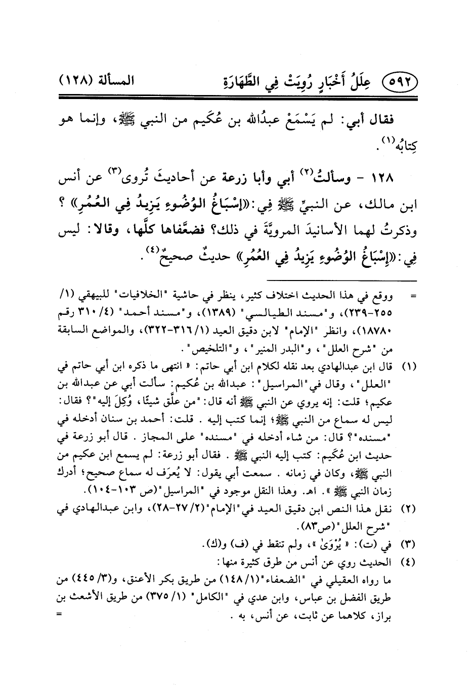 ١٢٨ - وسألتُ (٢) أَبِي وَأَبَا زُرْعَةَ عَنْ أحاديثَ تُروى (٣) عَنْ أَنَسِ بْنِ مَالِكٍ، عَنِ النبيِّ (ص) فِي: إسْبَاغُ الوُضُوءِ يَزِيدُ فِي العُمُرِ؟ وذكرتُ لَهُمَا الأسانيدَ المرويَّةَ فِي ذَلِكَ؟ فضعَّفاها كلَّها، وَقَالا: لَيْسَ فِي: إِسْبَاغُ الوُضُوءِ يَزِيدُ فِي العُمُرِ حديثٌ صحيحٌ (٤) .