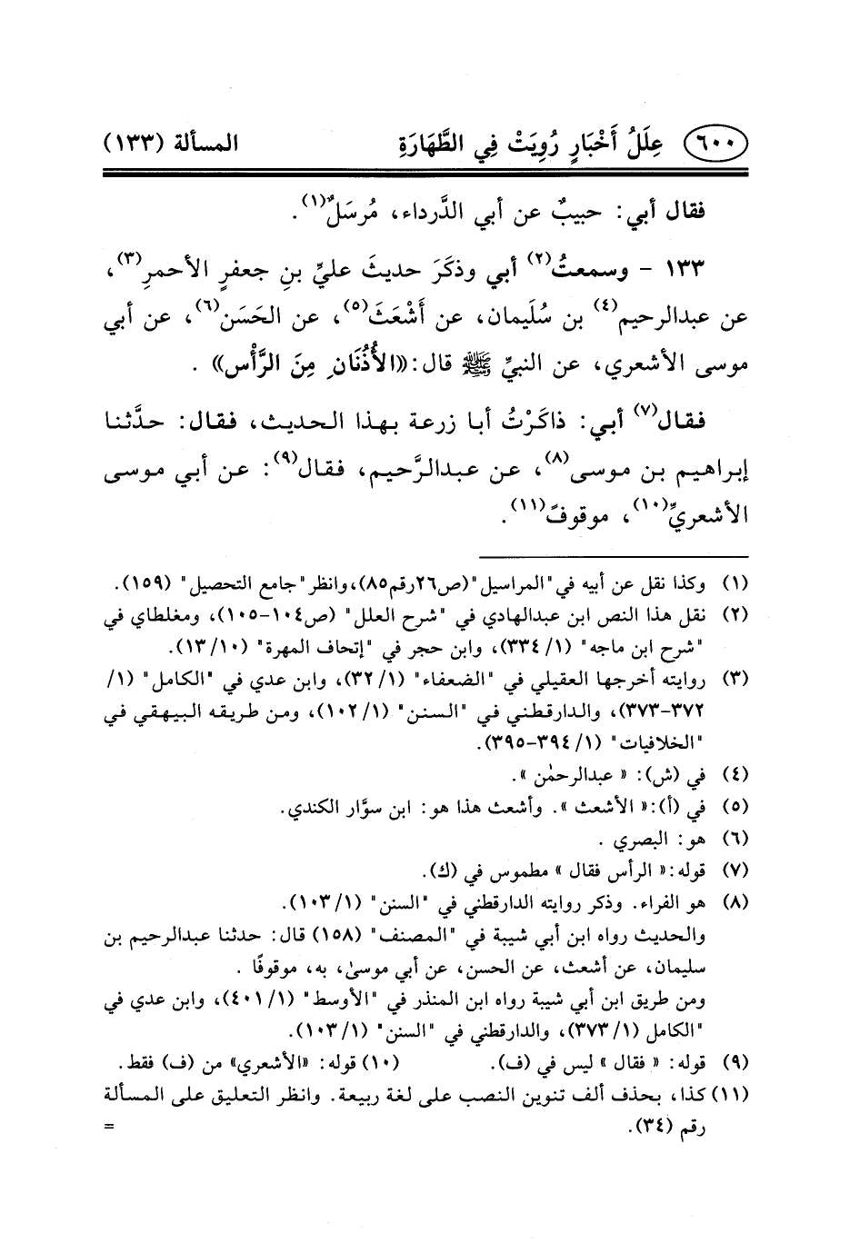 ١٣٣ - وسمعتُ (٢) أَبِي وذكَرَ حديثَ عليِّ ابنِ جعفرٍ الأحمرِ (٣) ، عن عبد الرحيم (٤) بن سُلَيمان، عن أَشْعَثَ (٥) ، عَنِ الحَسَن (٦) ، عَنْ أَبِي موسى الأشعري، عن النبيِّ (ص) قال: الأُذُنَان ِ مِنَ الرَّأْس.